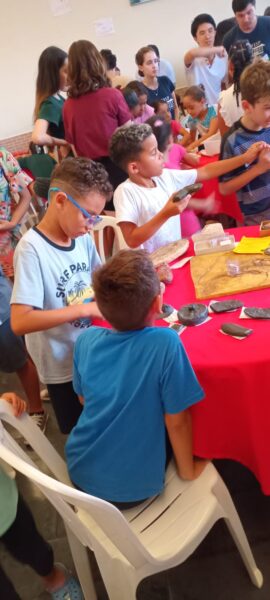 «O dia de hoje foi simplesmente inesquecível para as crianças! Elas adoraram as atividades propostas, interagiram com os universitários, fizeram perguntas e revelaram um grande interesse em aprender sobre paleontologia. Além disso, as brincadeiras não foram só divertidas, mas também cheias de aprendizado. Um momento que me marcou foi a dedicação do B. S. Desde o início até o final da atividade, ele permaneceu na mesa de fósseis, explorando cada detalhe. Com a lupa em mãos, observava atentamente, desmontava e montava os crânios do Tigre-dente-de-sabre e, apesar de ser um menino tímido, se sentia à vontade para conversar e tirar todas as suas dúvidas com o Danilo, estudante da UNIFESP. Essas atividades trouxeram uma experiência totalmente nova para eles. Tenho certeza de que este dia ficará para sempre em suas memórias!», disse a educadora Thais L.