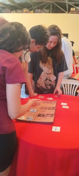 «No projeto de extensão em Paleontologia que fizemos no CCA, levamos um jogo da memória para ensinar as crianças de forma dinâmica e educativa sobre assuntos relacionados à Paleontologia. Depois que elas encontravam um par, entregávamos fichas explicativas que tinham uma imagem, explicações e curiosidades sobre o que foi encontrado. No final, quem ganhava o jogo da memória recebia uma miniatura de dinossauro em 3D como prêmio. Foi muito gratificante ver como elas se animaram e realmente se interessaram pelo assunto. As crianças aprenderam brincando e se divertindo.» (Giovanna L., aluna da UNIFESP)