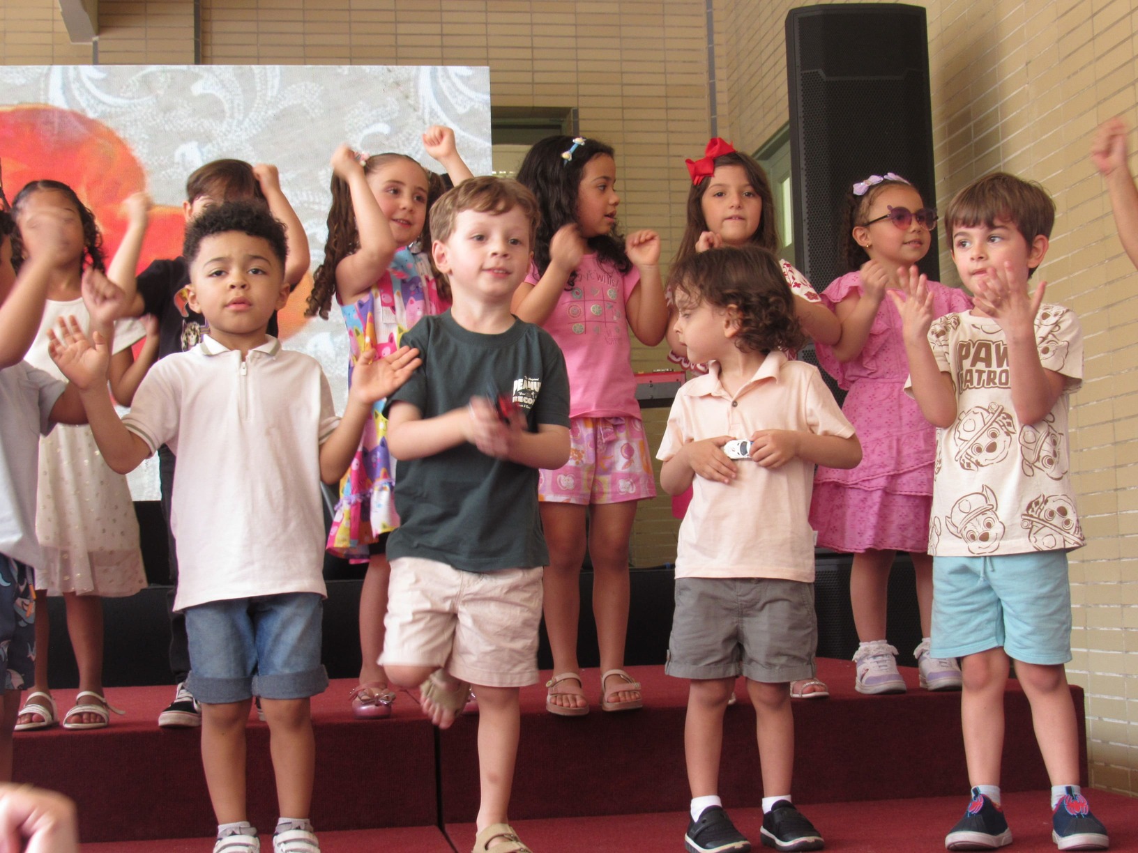 Logo após essa dinâmica entre banda, crianças e familiares, chegou a parte mais esperada por todos: os estudantes subiram ao palco para apresentar, junto com a banda, algumas das canções do projeto e também músicas em língua inglesa, selecionadas e ensaiadas pelos professores do Programa de Educação Bilíngue do Colégio. O público sorriu, cantou junto e se emocionou ao acompanhar a evolução de cada criança durante o processo.