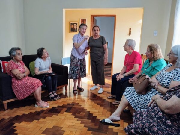 Depois da acolhida e momentos de prosa livre, Irmã Iracema Zóboli apresentou os novos membros da comunidade FMA: Irmã Ercilde Moratelli e Irmã Maria Plebani, que foram transferidas para Bagé neste ano e já estão atuando na missão daquela comunidade inserida.