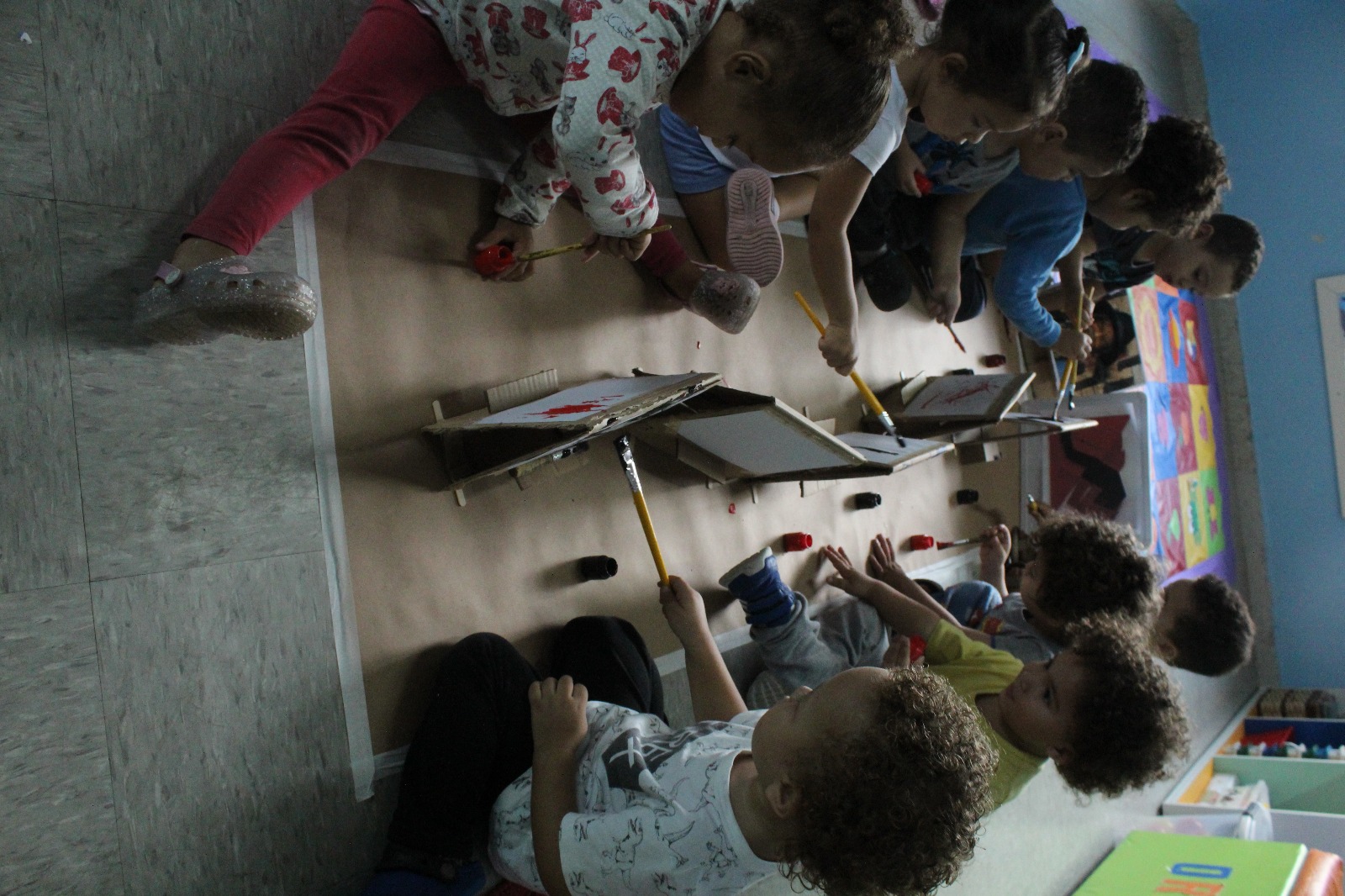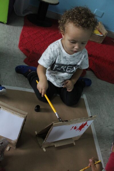 A professora montou cavaletes feitos de papelão, anexou uma folha, disponibilizou tinta e pincel, e as crianças fizeram a releitura da obra “Fenda preta” como inspiração. As crianças se sentaram umas de frente para as outras e começaram a pintar a partir da obra que foi exposta. «Nesta vivência apresentamos um pouco sobre nosso projeto raças e etnias - Raízes sem racismo: construindo pontes, não muros. As crianças precisam ser e sentir-se respeitadas, acolhidas, independente de crença e etnia, ou religião, e desde muito cedo precisam aprender a conviver com a diversidade não somente no ambiente escolar, mas no seu dia a dia, no ambiente familiar, ou seja, constantemente em nossa unidade».