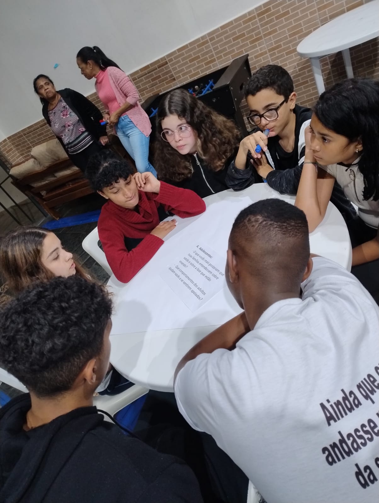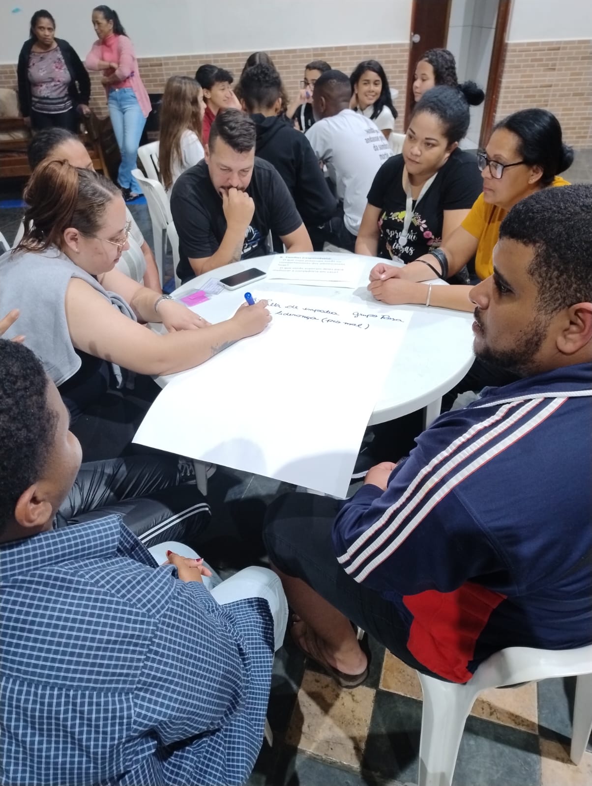 O momento mais rico aconteceu durante o trabalho em grupos, em que adolescentes e responsáveis responderam a perguntas sobre expectativas, preocupações e formas de apoio mútuo. As produções foram registradas em cartazes e coladas em um mural coletivo. As falas revelaram tanto preocupações comuns — como a influência dos amigos, o uso das redes sociais e a falta de diálogo — quanto desejos de aproximação, respeito e confiança entre famílias e jovens.
