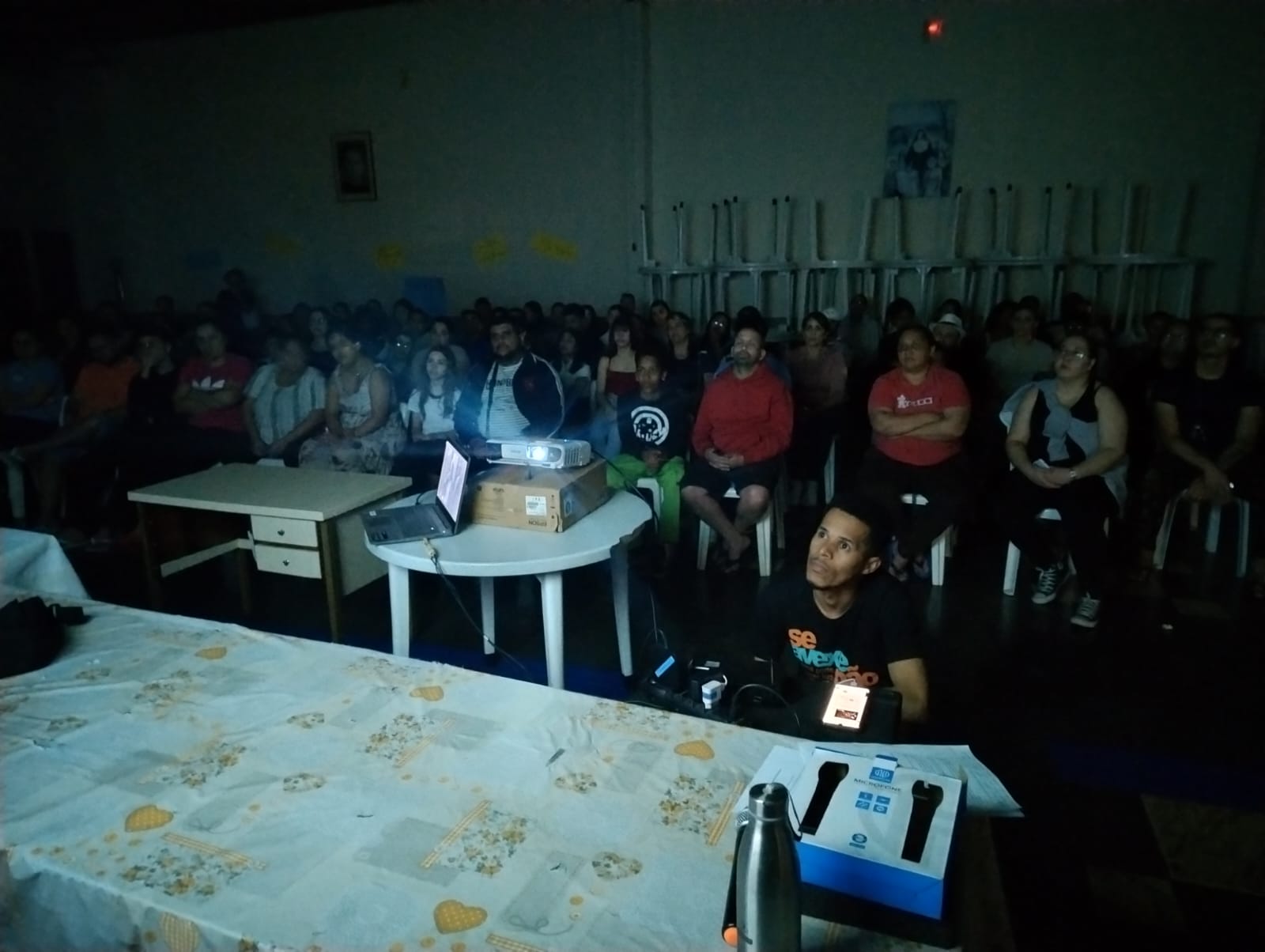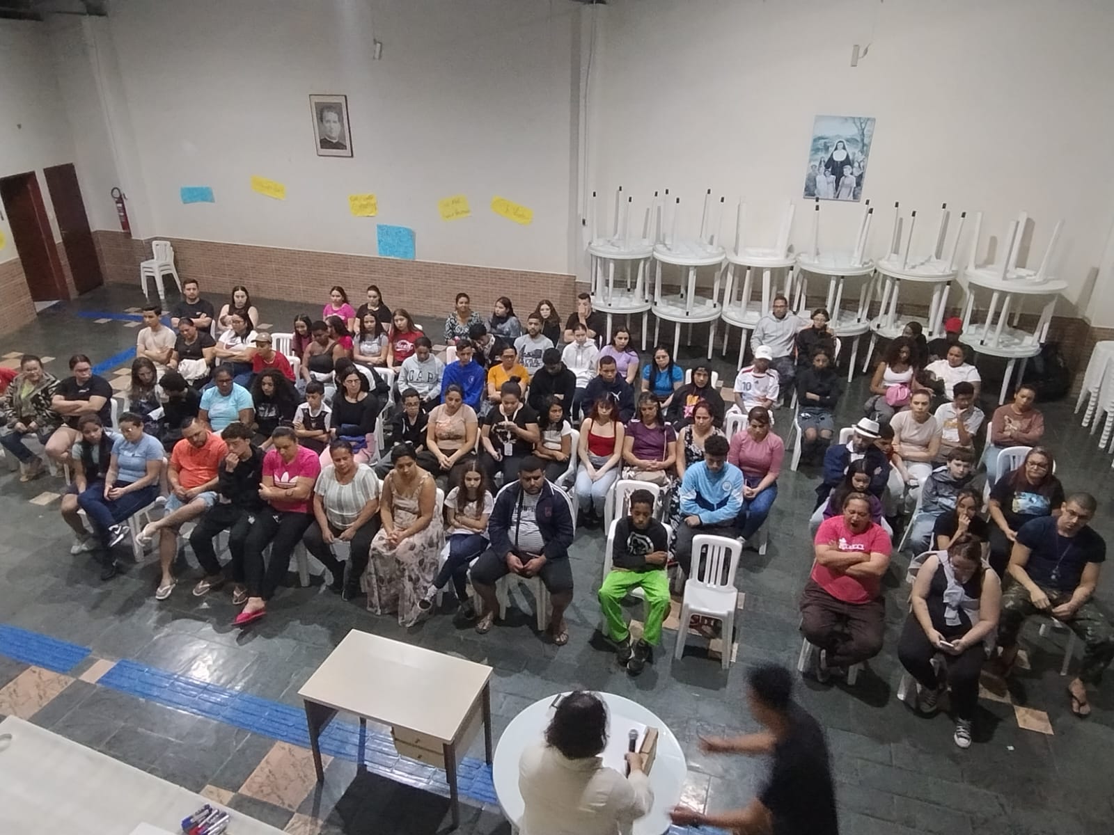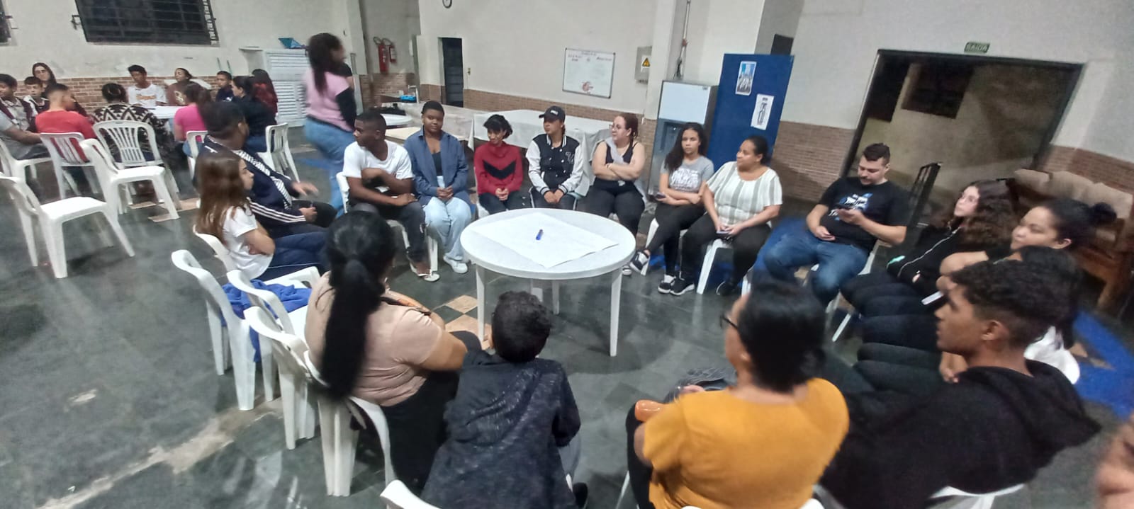 A atividade teve início com uma ambientação diferenciada: todos os participantes foram recebidos com uma encenação que simulava o “caos” vivido pelos adolescentes em seu cotidiano, marcado pelo excesso de estímulos, informações desencontradas e pressões diversas. A intenção foi gerar estranhamento e abrir espaço para a reflexão sobre como essas situações impactam a convivência familiar e o desenvolvimento dos jovens. Na sequência, o ambiente foi reorganizado com a colaboração de todos e os educadores convidaram os presentes a sentar e dialogar. Foi apresentada a proposta do encontro: criar um espaço de escuta, troca de experiências e construção conjunta entre adolescentes, famílias e CCA.