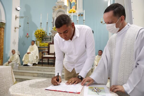 No último dia 29 de janeiro, a Basílica Nossa Senhora Auxiliadora, em Jaboatão dos Guararapes (PE), acolheu a celebração de Profissão Religiosa temporária dos Salesianos Gabriel Brito Guirão e Gustavo Jin Lee, ex-alunos respectivamente do Colégio Auxiliadora de Ribeirão Preto e do Colégio de Santa Inês (SP). O lema escolhido por eles foi “Permanecei no meu amor” (João 15, 9).