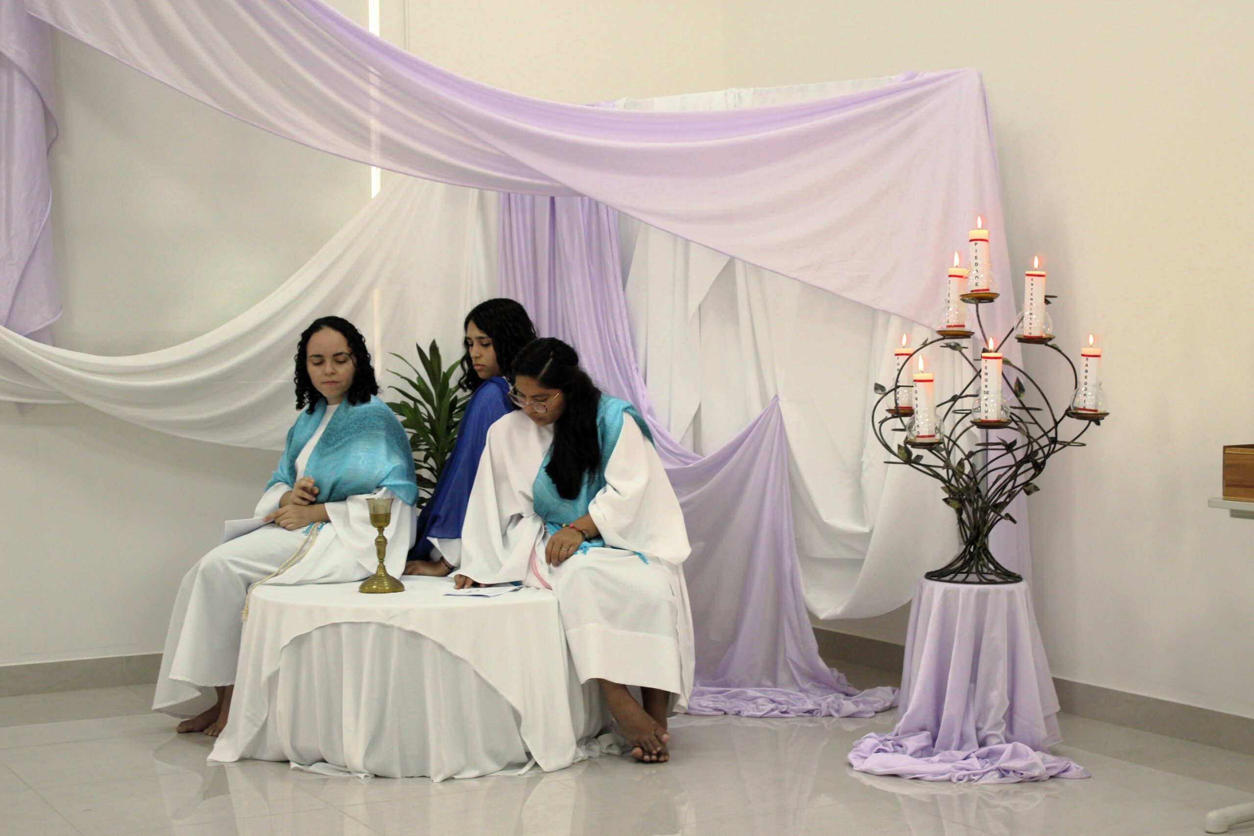 A figura da Santíssima Trindade, ou seja, o quadro formado pela voz, pela luz e pela presença do Pai, do Filho e do Espírito Santo; uma mesa em que o cálice é o centro. A partir desse momento, para mim se descortinou um grande momento de oração e de interioridade, que foi crescente, caminhando para a escuta — a escuta da voz dos personagens que, com a concha, ouviam a voz: a voz que vem de dentro e de fora.