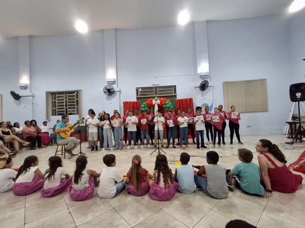 O educador Guilherme, do curso de música também preparou dois corais, sendo um com os educandos do turno da manhã e outro com os educandos do turno da tarde. E o grupo da Infância Missionária cantou o próprio hino e a música Deus é bonito, do Padre Zezinho, mostrando a missão que eles têm “Criança ajuda e evangeliza criança”.