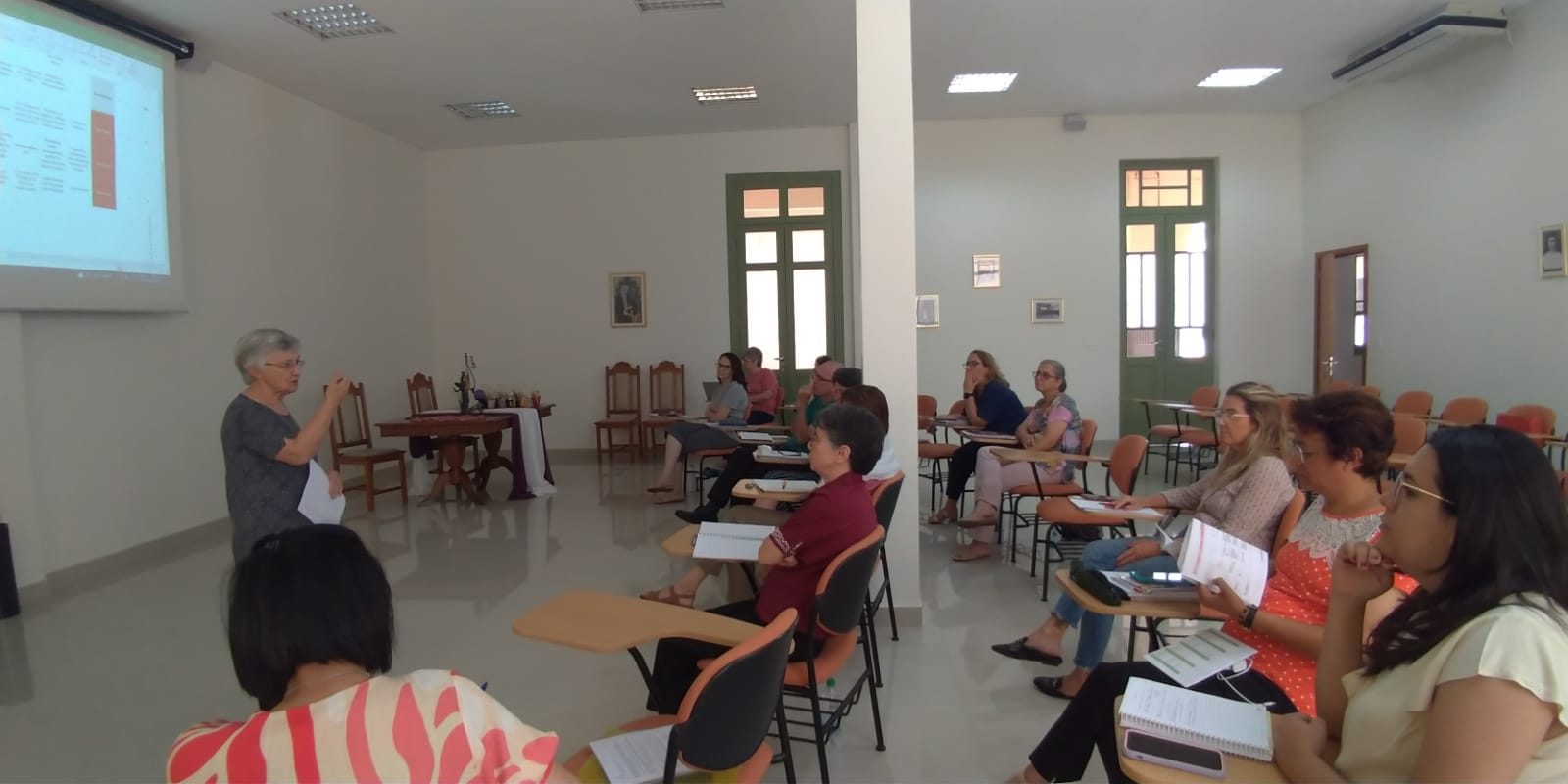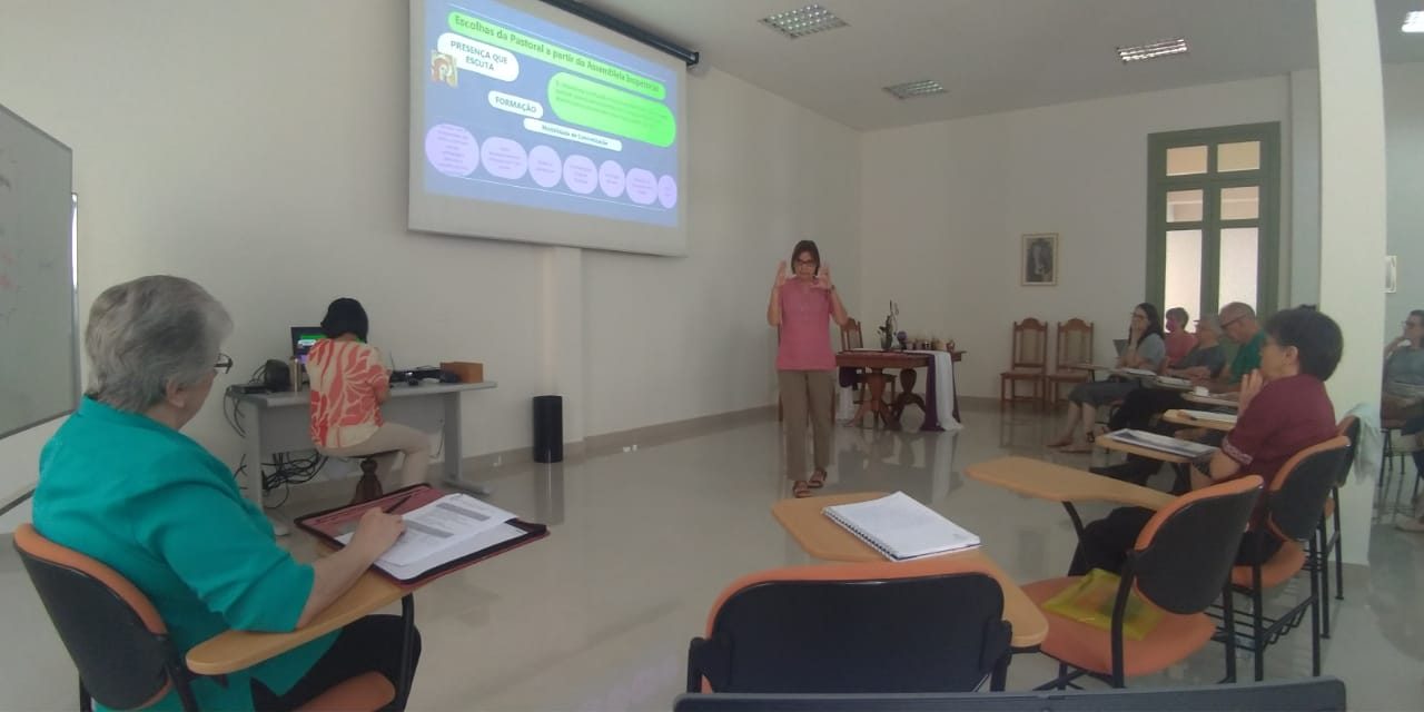 Assim, o Núcleo Animador se debruçou sobre o empenho da caminhada de cada Âmbito, apreciando as propostas contempladas pelas Linhas de Ação das opções prioritárias: Formação, Sinodalidade Missionária e Ecologia Integral, já elaboradas ou em construção, apresentadas pelas respectivas Irmãs responsáveis. Irmã Teresa Cristina Pisani Domiciano (Missão-Pastoral) e Irmã Dorcelina Rampi (Administrativo) realizaram a apresentação no período da manhã.
