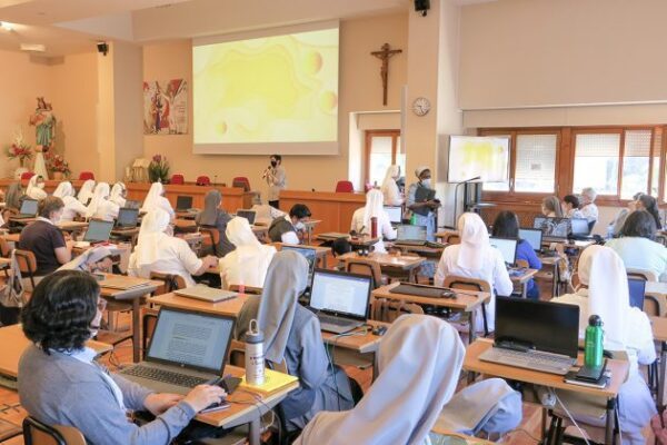 O dia começou na Capela, com a Celebração Eucarística presidida pelo Pe. Jesus Manuel García, Salesiano de Dom Bosco, capelão da Casa Geral, que incentivou a viver em atitude de abertura e disponibilidade às inspirações do Espírito Santo, que orienta na busca de novos caminhos, para empreender como Instituto com fidelidade carismática e audácia apostólica.