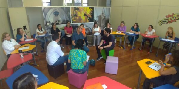 A programação do encontro foi organizada a partir do Projeto “Com-PAR-Trilhares” e a metodologia escolhida para este momento formativo foi o Design For Change (Criativos da Escola), que se baseia em “princípios do Design Thinking, processo centrado nas pessoas, que pensam juntas nos desafios da realidade e em possíveis formas de superá-los, sendo uma ferramenta que estimula a criação, realizada em situações de interação, experimentação e colaboração”, de acordo com o Currículo da Rede Salesiana Brasil de Escolas (RSB-Escolas). Refletindo sobre os “milagres para abraçar” e mobilizando boas práticas, as Coordenações Pedagógicas e as Orientações Educacionais da AEIS-SP tiveram a oportunidade de vivenciar as quatro etapas da metodologia DFC: Sentir, Imaginar, Fazer e Compartilhar.