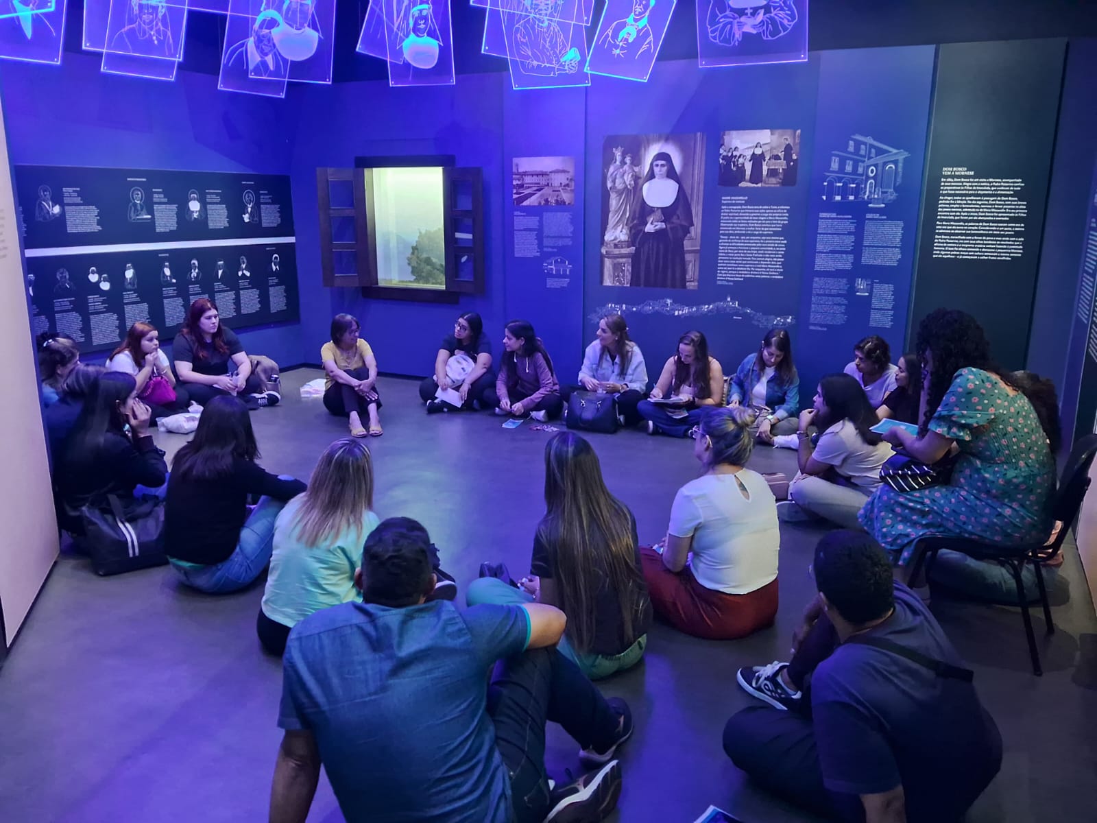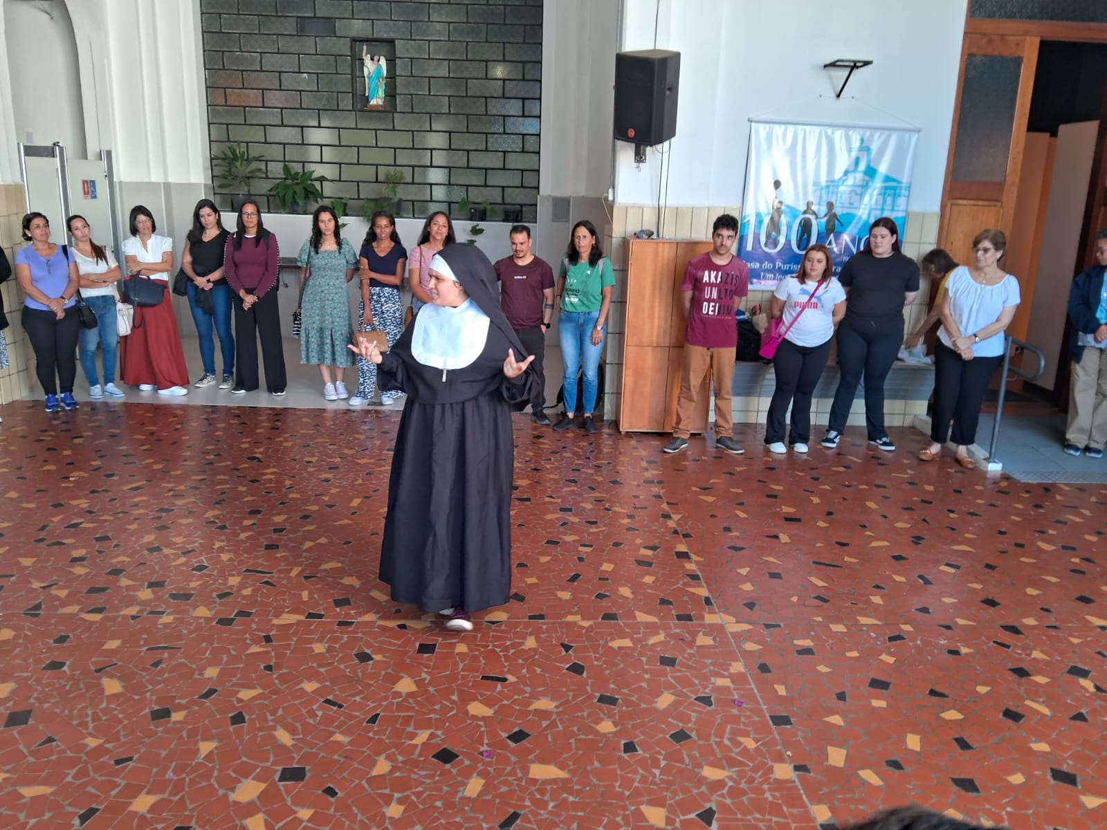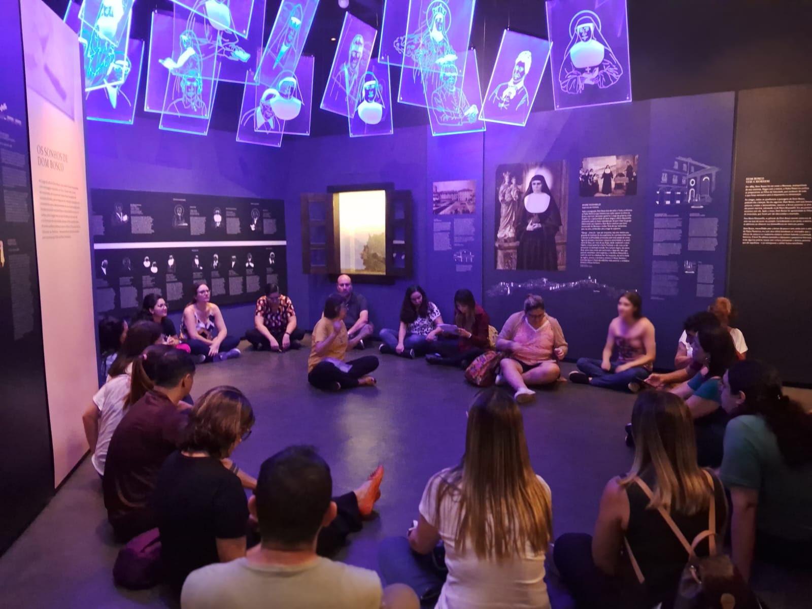 Ao finalizar as oficinas, os educadores se reuniram na capela da Casa do Puríssimo Coração de Maria e conheceram um pouco de sua história contada detalhadamente pela Irmã Luana, assim como a da Gruta de Nossa Senhora de Lourdes situada na entrada desse espaço sagrado.