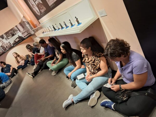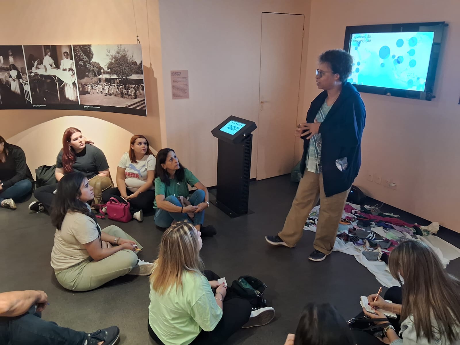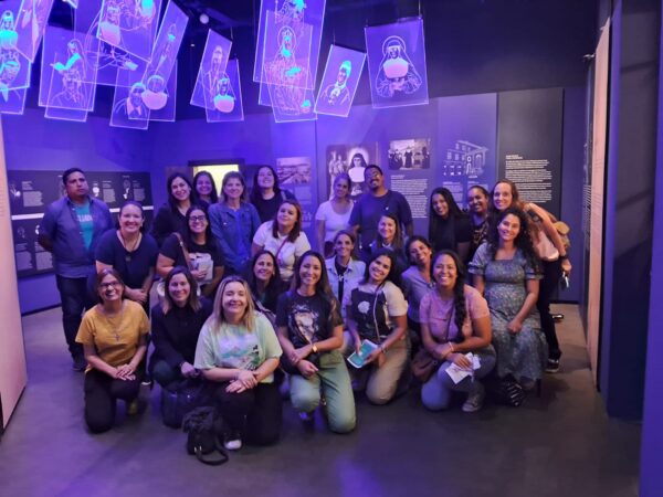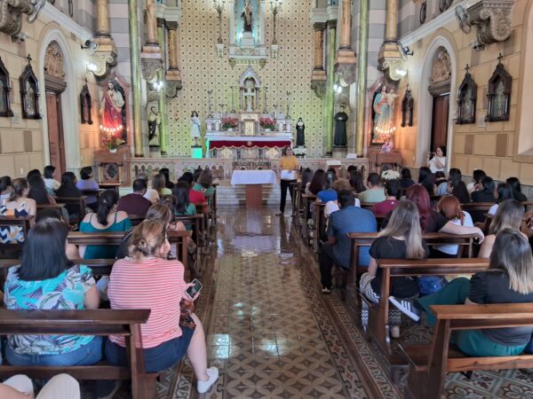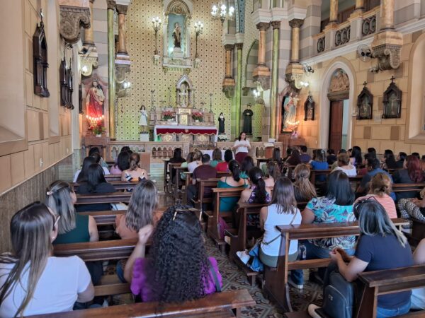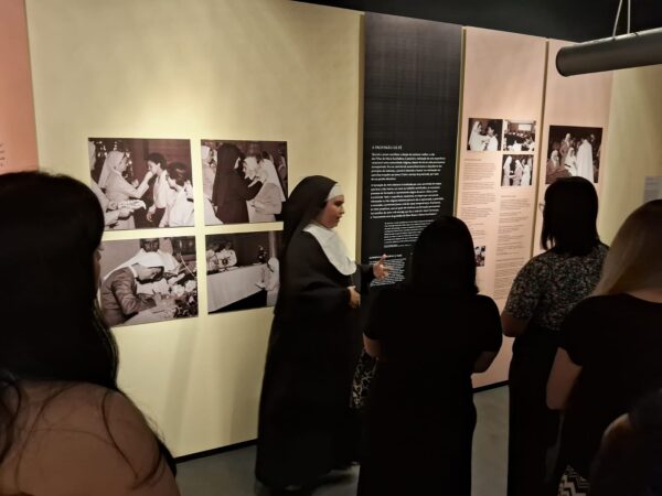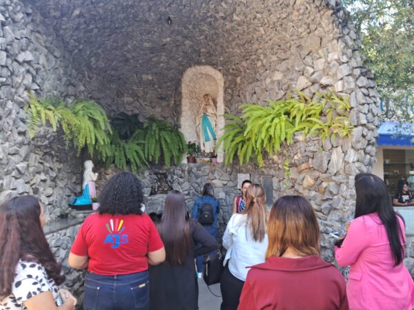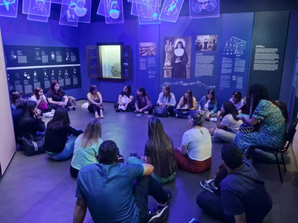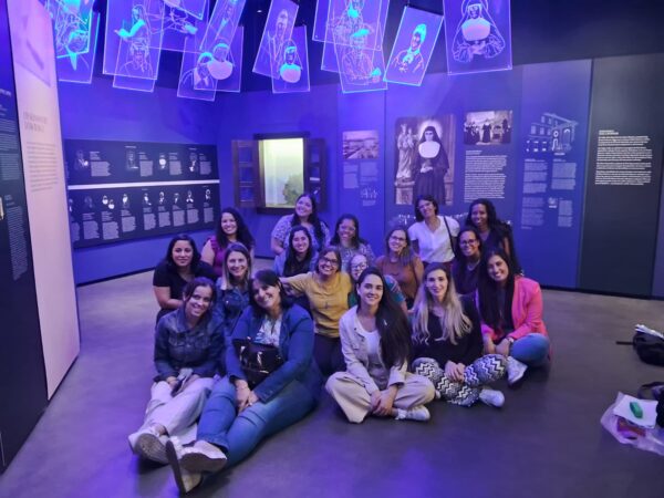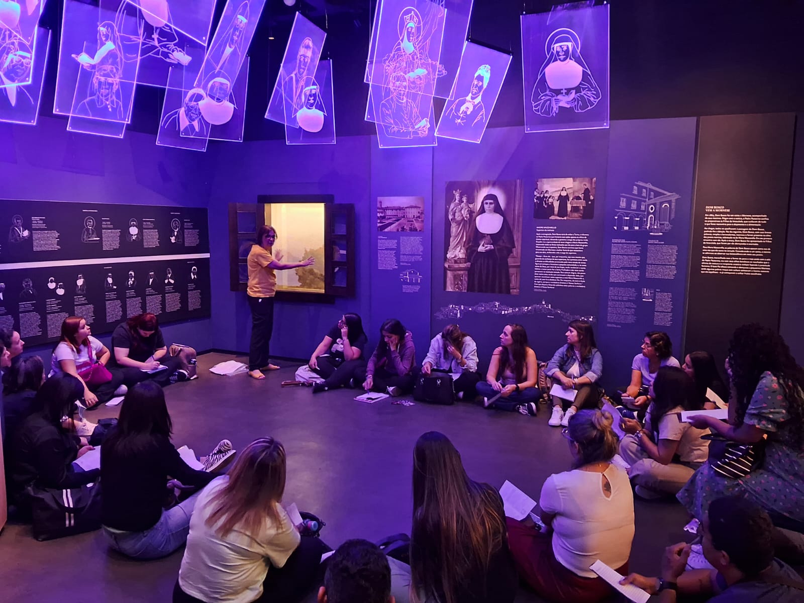 Ao finalizar as oficinas, os educadores se reuniram na capela da Casa do Puríssimo Coração de Maria e conheceram um pouco de sua história contada detalhadamente pela Irmã Luana, assim como a da Gruta de Nossa Senhora de Lourdes situada na entrada desse espaço sagrado.