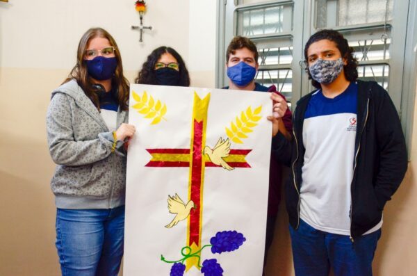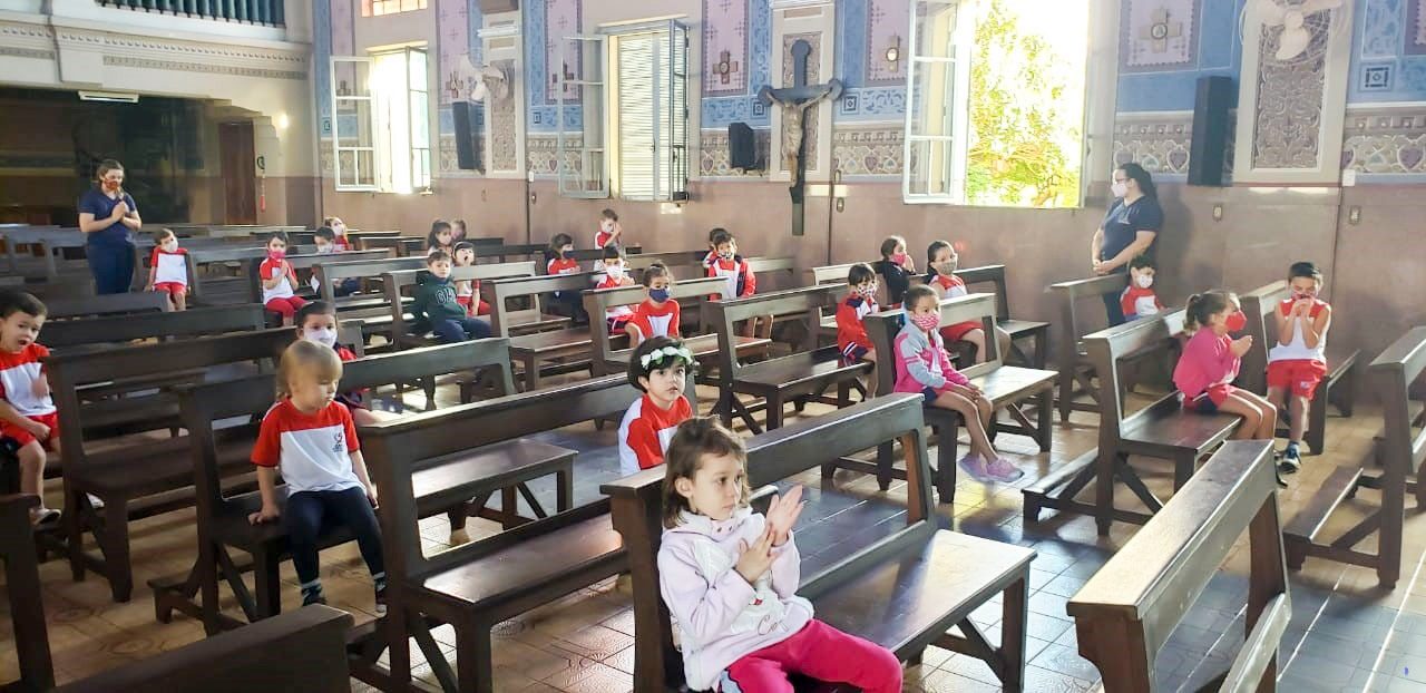 A festa na Escola foi linda, mesmo com a pandemia, num gesto significativo, ministros da eucaristia com a Irmã Beth, Diretora Institucional, estiveram com a presença do santíssimo passeando por ambiente escolar.