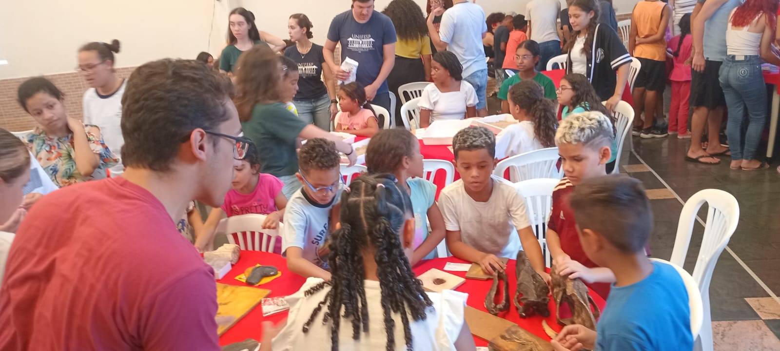 «O dia de hoje foi simplesmente inesquecível para as crianças! Elas adoraram as atividades propostas, interagiram com os universitários, fizeram perguntas e revelaram um grande interesse em aprender sobre paleontologia. Além disso, as brincadeiras não foram só divertidas, mas também cheias de aprendizado. Um momento que me marcou foi a dedicação do B. S. Desde o início até o final da atividade, ele permaneceu na mesa de fósseis, explorando cada detalhe. Com a lupa em mãos, observava atentamente, desmontava e montava os crânios do Tigre-dente-de-sabre e, apesar de ser um menino tímido, se sentia à vontade para conversar e tirar todas as suas dúvidas com o Danilo, estudante da UNIFESP. Essas atividades trouxeram uma experiência totalmente nova para eles. Tenho certeza de que este dia ficará para sempre em suas memórias!», disse a educadora Thais L.