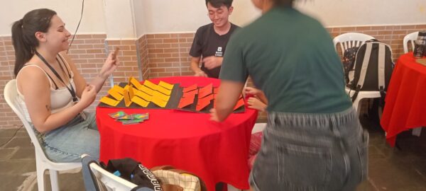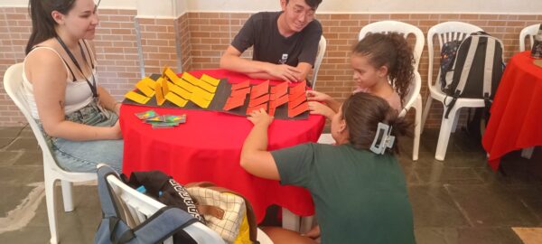 «No projeto de extensão em Paleontologia que fizemos no CCA, levamos um jogo da memória para ensinar as crianças de forma dinâmica e educativa sobre assuntos relacionados à Paleontologia. Depois que elas encontravam um par, entregávamos fichas explicativas que tinham uma imagem, explicações e curiosidades sobre o que foi encontrado. No final, quem ganhava o jogo da memória recebia uma miniatura de dinossauro em 3D como prêmio. Foi muito gratificante ver como elas se animaram e realmente se interessaram pelo assunto. As crianças aprenderam brincando e se divertindo.» (Giovanna L., aluna da UNIFESP)