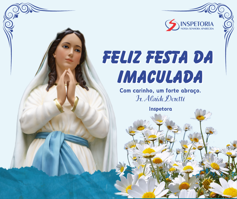 Desejo a todas as comunidades educativas da Inspetoria Nossa Senhora Aparecida (BAP) que a Celebração da Festa da Imaculada renove a nossa esperança, a fé e a fraternidade. Que a Luz e a proteção de Maria estejam sempre conosco, guiando-nos em cada passo do caminho. Que a história dos 151 anos do Instituto das FMA e dos 131 anos de Brasil, seja uma fonte de inspiração e de renovação, tornando-nos pessoas geradoras de VIDA na comunidade e na missão. A presença de Maria em nossa vida continue a iluminar e conduzir nosso caminho, fecundando a vida, a palavra e a missão de todos nós.