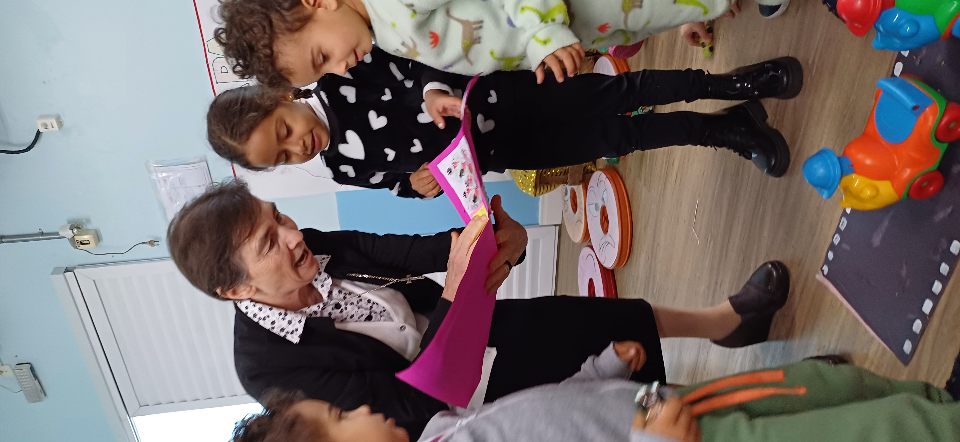 No CEI Pingo de Gente, a Irmã Paola foi recebida pela equipe coordenadora: Rosana Freitas, Diretora; Janaina Santos, Coordenadora Pedagógica; e Lindaura Nunes, Auxiliar Administrativa. Durante a visita, a turma do Mini Grupo 2 preparou uma apresentação simbólica em que construíram uma casa de tijolos, reforçando a importância da união e do trabalho em conjunto. A Irmã teve ainda um momento de partilha com as professoras, e os demais colaboradores (auxiliar de cozinha, apoio e enfermaria), destacando que a missão de todos nasce no coração e que o papel da educação é fundamental para o desenvolvimento humano.
