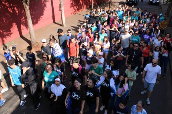 A Juventude Salesiana do Colégio Auxiliadora parou as ruas de Ribeirão Preto (SP), no último sábado, 2 de setembro, para celebrar os 25 anos de história da AJS (Articulação da Juventude Salesiana). O evento reuniu alunos, ex-alunos e colaboradores que fizeram e ainda fazem parte do movimento. Para que a comemoração ficasse mais especial, a organização convidou a Irmã Teresa Cristina Domiciano, Coordenadora da Pastoral Juvenil Inspetorial, e a Irmã Cleonice Lourenço, Coordenadora de Animação Vocacional e da Articulação da Juventude Salesiana – ambas da Inspetoria Nossa Senhora Aparecida (BAP), de São Paulo. Quem também marcou presença foi o padre Rafael Galvão, Salesiano de Dom Bosco.