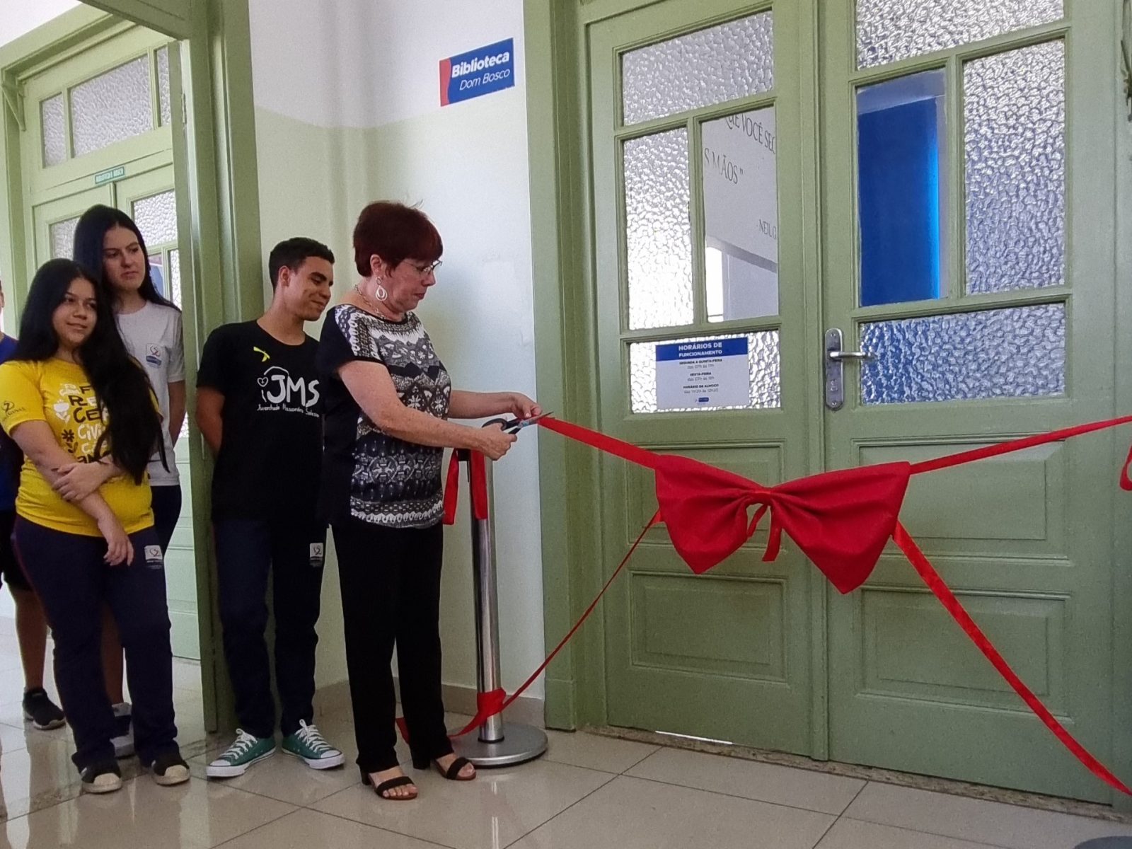 Após o corte da fita, marcando oficialmente a inauguração do espaço, foi realizado um sarau, protagonizado pela turma do 8º Ano e orientado pelo professor de língua portuguesa, Pedro Paulo da Silva de Sá. Os jovens recitaram e encenaram textos redigidos pelo próprio professor. Ao final, uma salva de palmas e parabenizações pela apresentação realizada. Dando prosseguimento à cerimônia, alunos, educadores e demais membros da comunidade educativa que estavam presentes puderam circular pelo espaço e se familiarizar com ele, descobrindo as novidades que estão disponíveis, como as novas salas de estudo, estúdio de gravação e de podcast. Ao longo do dia, as demais turmas do Ensino Fundamental Anos Finais e Médio também puderam visitar a nova Biblioteca Dom Bosco.
