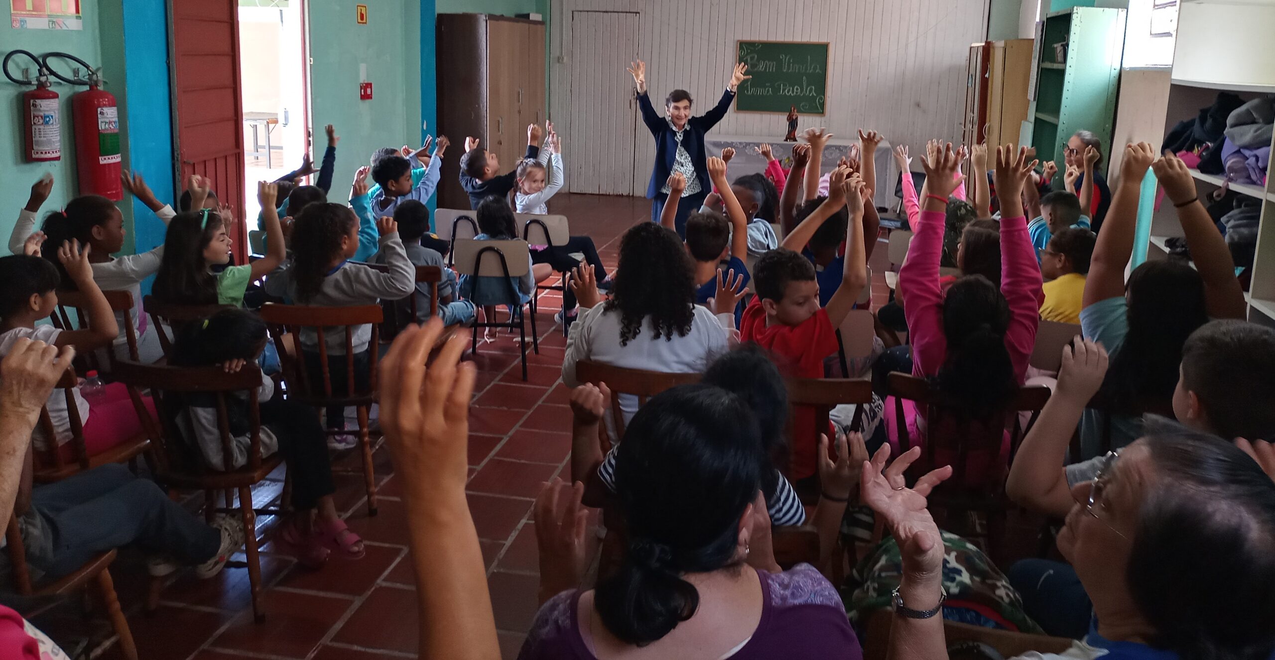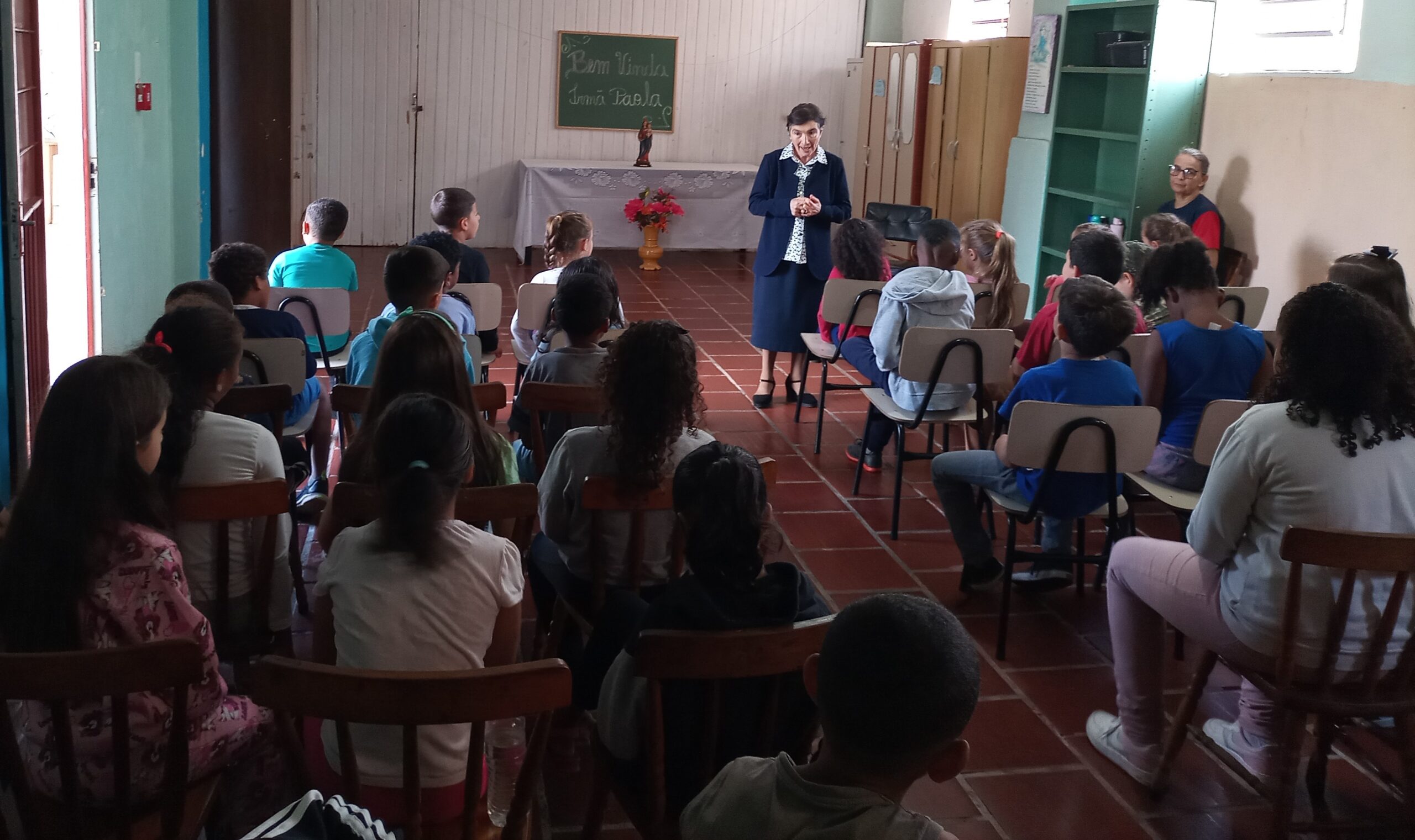 Neste dia também, Irmã Paola ofereceu o “Bom-Dia” e “Boa-Tarde” para a comunidade educativa, os quais foram iniciados com as apresentações realizadas pelos educandos e, na sequência, uma significativa mensagem dada pela Conselheira. Ainda em clima pascal, os educandos da manhã cantaram com muita animação a música “Por que Ele vive”. Aos educandos da manhã, Irmã Paola contou a história da “Estrela Verde”, enfatizando a importância de ser luz, de ter brilho nos olhos para iluminar a si e aos outros.
