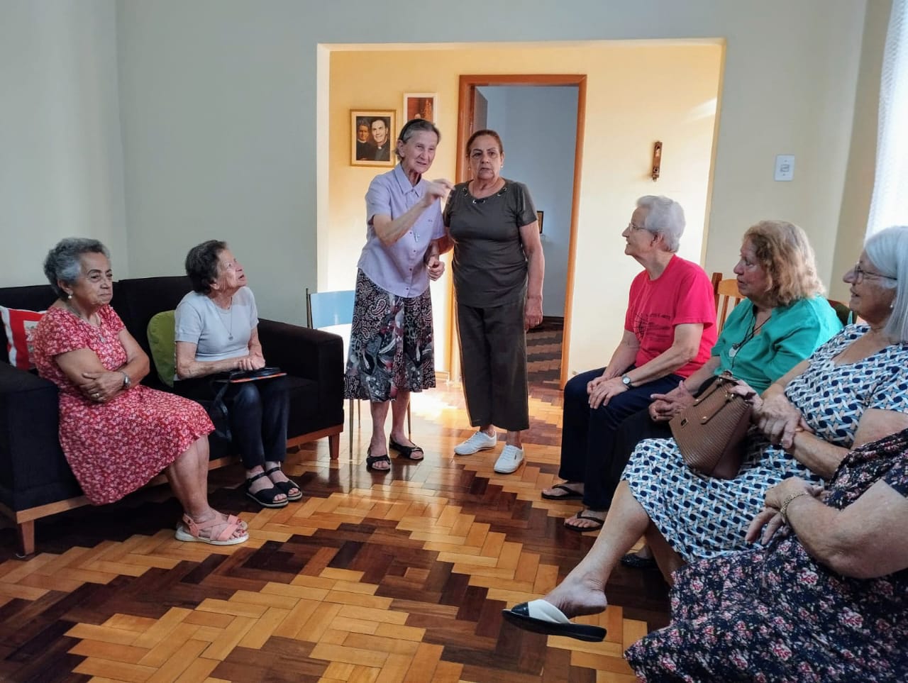 Irmã Ercilde, diretora da comunidade FMA, deu continuidade ao encontro convidando as participantes a se apresentarem, dizendo o próprio nome e o grupo de pertença à FS, o seu envolvimento na pastoral escolar e/ou na pastoral paroquial. A maioria das presentes atuam ou já atuaram como professoras e também na catequese sacramental e animação litúrgica, ou ainda como ministras extraordinárias da Eucaristia.