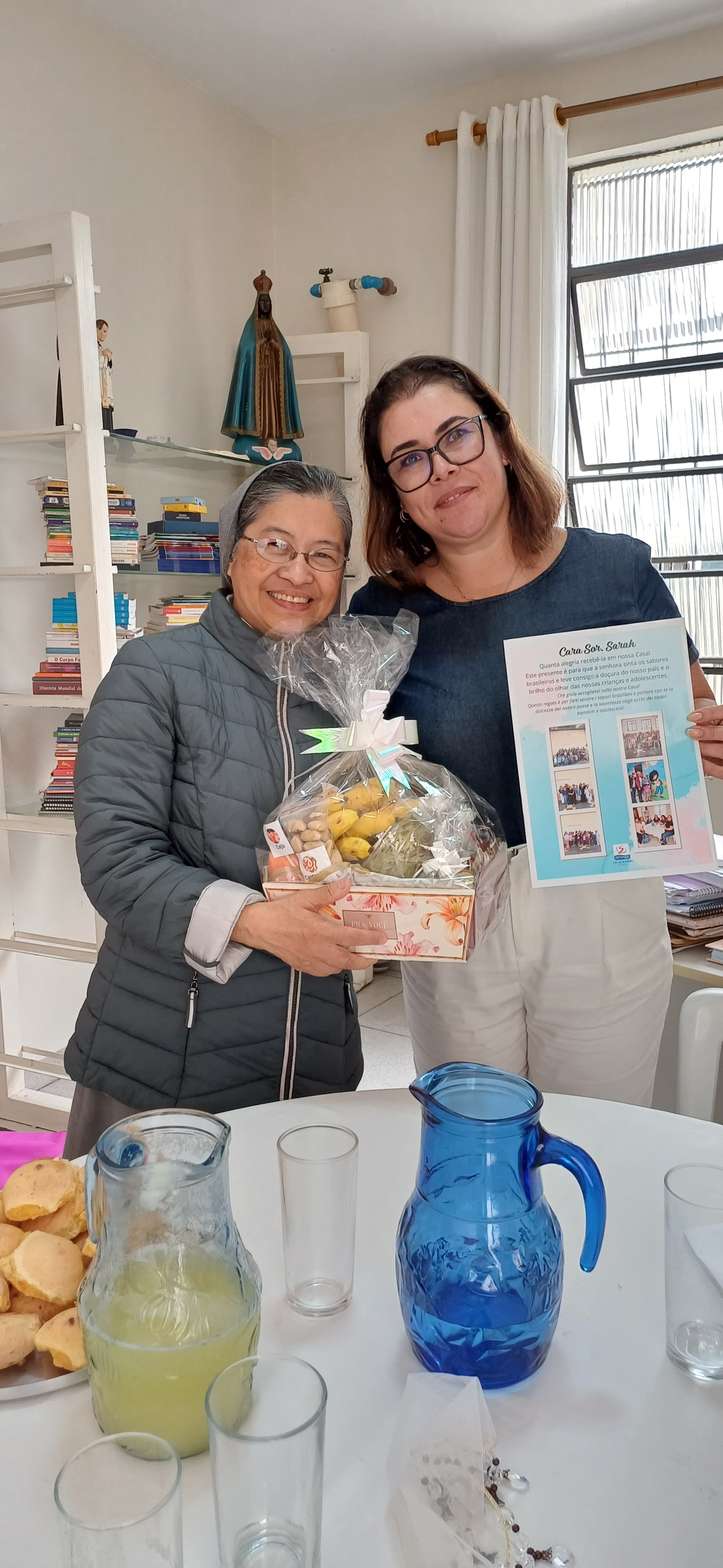 Como forma de gratidão pela visita, foi entregue a Irmã Sarah uma cesta de frutas e castanhas, representando os sabores autênticos e ricos do Brasil. Esse gesto simples, porém, carregado de simbolismo, trouxe doçura ao encontro, refletindo o brilho nos olhos de todos os presentes.