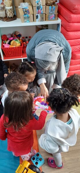 As crianças e adolescentes do CCA Santa Lúcia receberam Irmã Sarah com entusiasmo, protagonizando apresentações que destacaram as atividades educativas e sociais desenvolvidas na Instituição. Foi um momento de alegria, em que a dedicação e o talento das crianças revelaram a importância desse espaço na vida de cada uma delas. A visita também se estendeu ao Centro de Educação Infantil – CEI Pingo de Gente, onde o clima foi de afeto e proximidade. Irmã Sarah teve a oportunidade de interagir com os bebês e os educadores, num ambiente de ternura que tocou profundamente a todos os presentes.