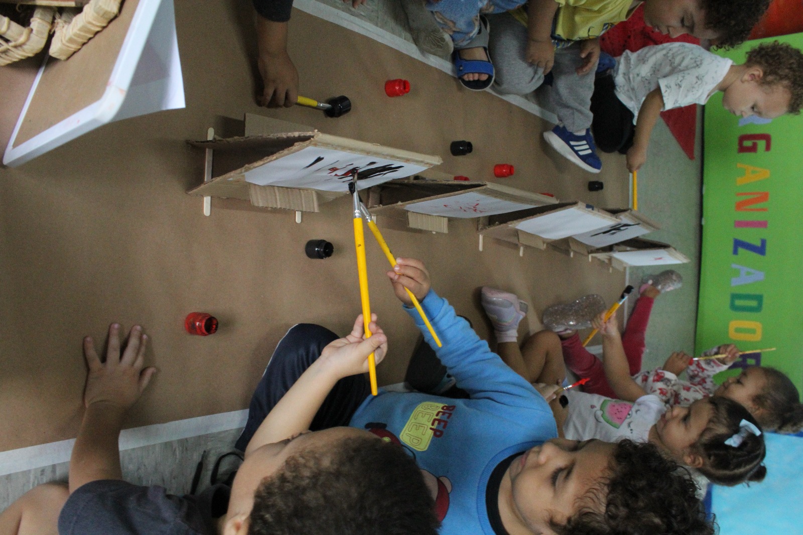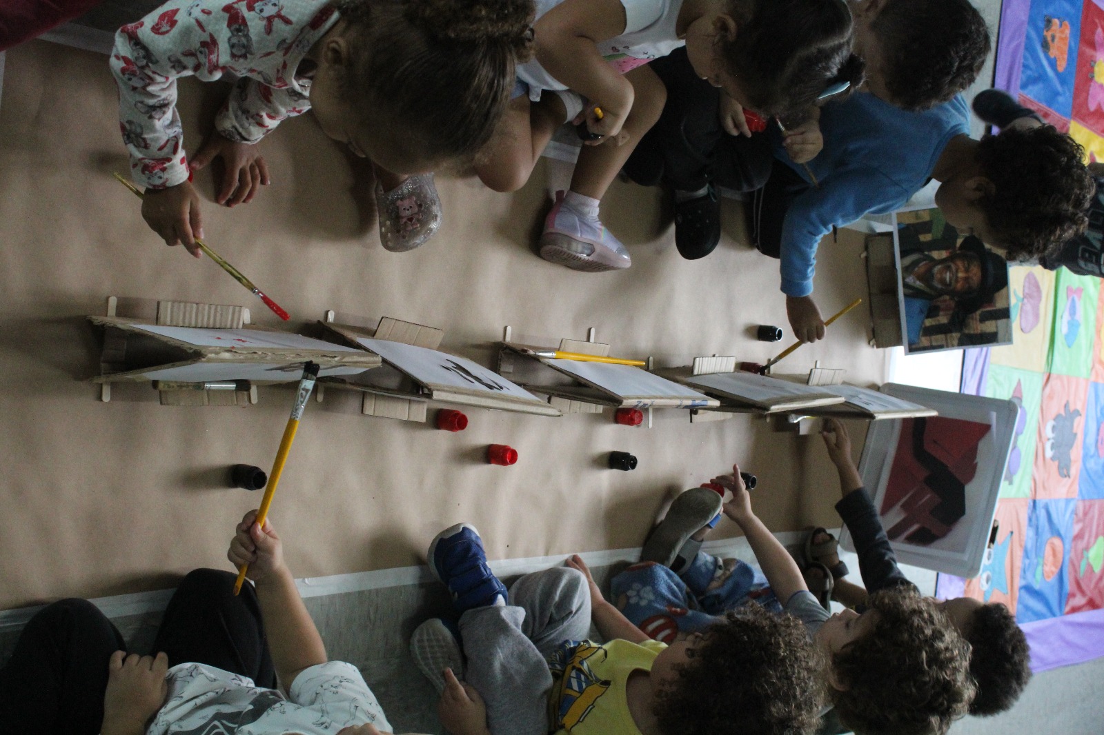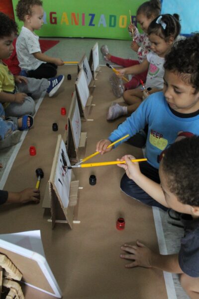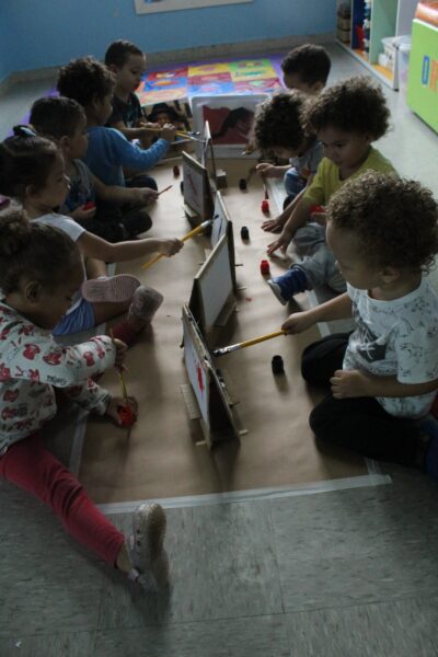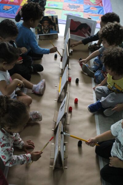 A professora montou cavaletes feitos de papelão, anexou uma folha, disponibilizou tinta e pincel, e as crianças fizeram a releitura da obra “Fenda preta” como inspiração. As crianças se sentaram umas de frente para as outras e começaram a pintar a partir da obra que foi exposta. «Nesta vivência apresentamos um pouco sobre nosso projeto raças e etnias - Raízes sem racismo: construindo pontes, não muros. As crianças precisam ser e sentir-se respeitadas, acolhidas, independente de crença e etnia, ou religião, e desde muito cedo precisam aprender a conviver com a diversidade não somente no ambiente escolar, mas no seu dia a dia, no ambiente familiar, ou seja, constantemente em nossa unidade».