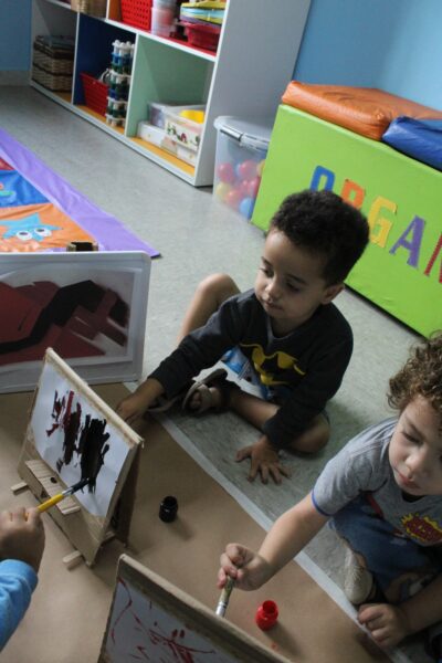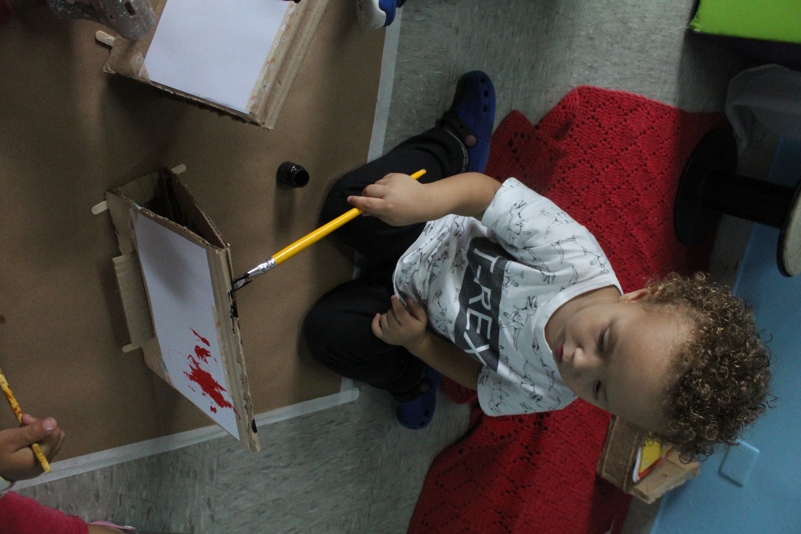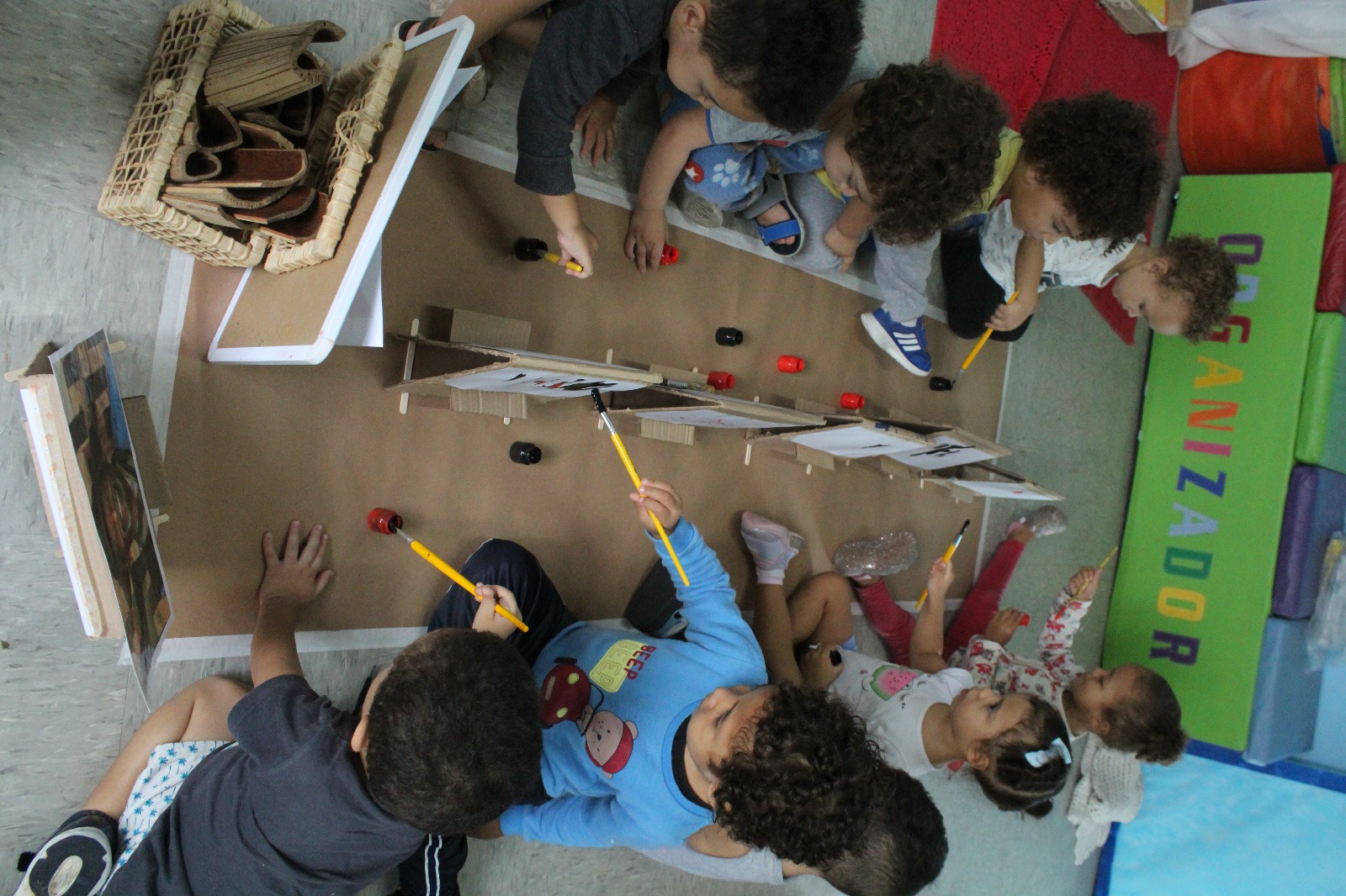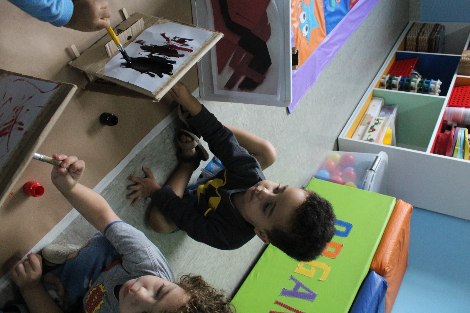 A professora montou cavaletes feitos de papelão, anexou uma folha, disponibilizou tinta e pincel, e as crianças fizeram a releitura da obra “Fenda preta” como inspiração. As crianças se sentaram umas de frente para as outras e começaram a pintar a partir da obra que foi exposta. «Nesta vivência apresentamos um pouco sobre nosso projeto raças e etnias - Raízes sem racismo: construindo pontes, não muros. As crianças precisam ser e sentir-se respeitadas, acolhidas, independente de crença e etnia, ou religião, e desde muito cedo precisam aprender a conviver com a diversidade não somente no ambiente escolar, mas no seu dia a dia, no ambiente familiar, ou seja, constantemente em nossa unidade».