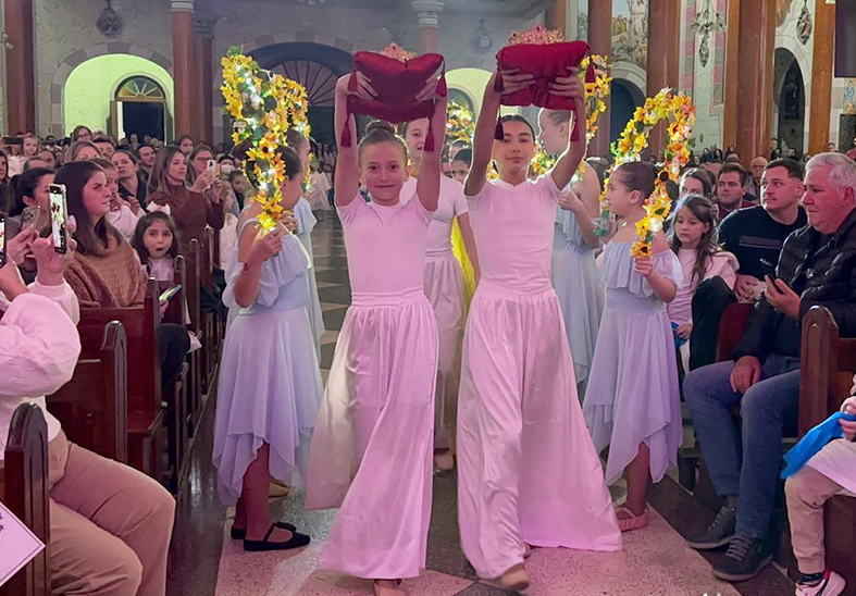 As crianças do Infantil 3 se fizeram presentes, acenando com bandeirinhas no corredor principal, garantindo o clima festivo. Uma família do Colégio Dom Bosco e outra do IMA também participaram trazendo as oferendas para o ofertório da Missa.