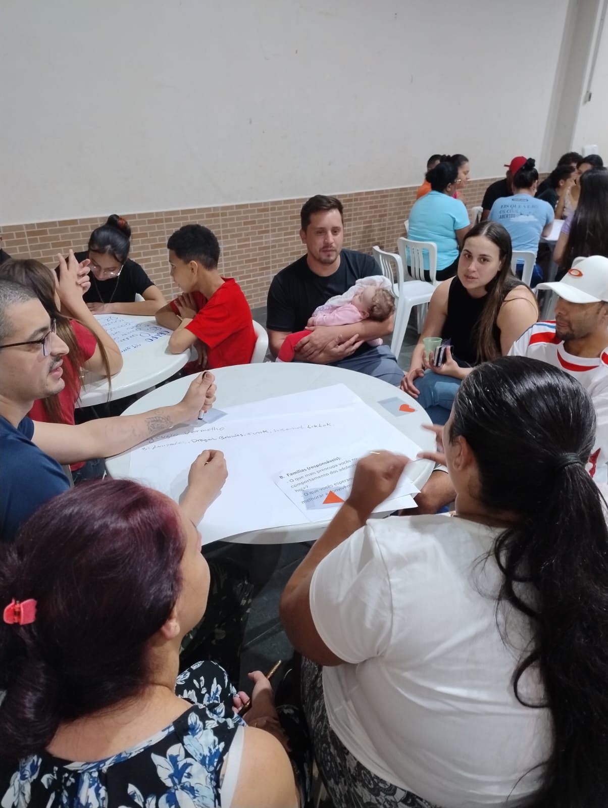 Na partilha final, os grupos reforçaram a importância de promover mais encontros como este, investir em rodas de conversa e fortalecer a parceria entre CCA, adolescentes e famílias. O encerramento foi marcado por um gesto simbólico: cada responsável procurou seu filho, escolheu uma palavra que resumisse o aprendizado do encontro e expressou seu carinho em um abraço.