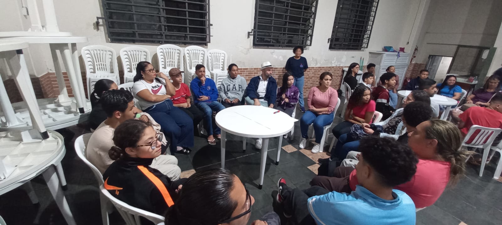 A atividade teve início com uma ambientação diferenciada: todos os participantes foram recebidos com uma encenação que simulava o “caos” vivido pelos adolescentes em seu cotidiano, marcado pelo excesso de estímulos, informações desencontradas e pressões diversas. A intenção foi gerar estranhamento e abrir espaço para a reflexão sobre como essas situações impactam a convivência familiar e o desenvolvimento dos jovens. Na sequência, o ambiente foi reorganizado com a colaboração de todos e os educadores convidaram os presentes a sentar e dialogar. Foi apresentada a proposta do encontro: criar um espaço de escuta, troca de experiências e construção conjunta entre adolescentes, famílias e CCA.