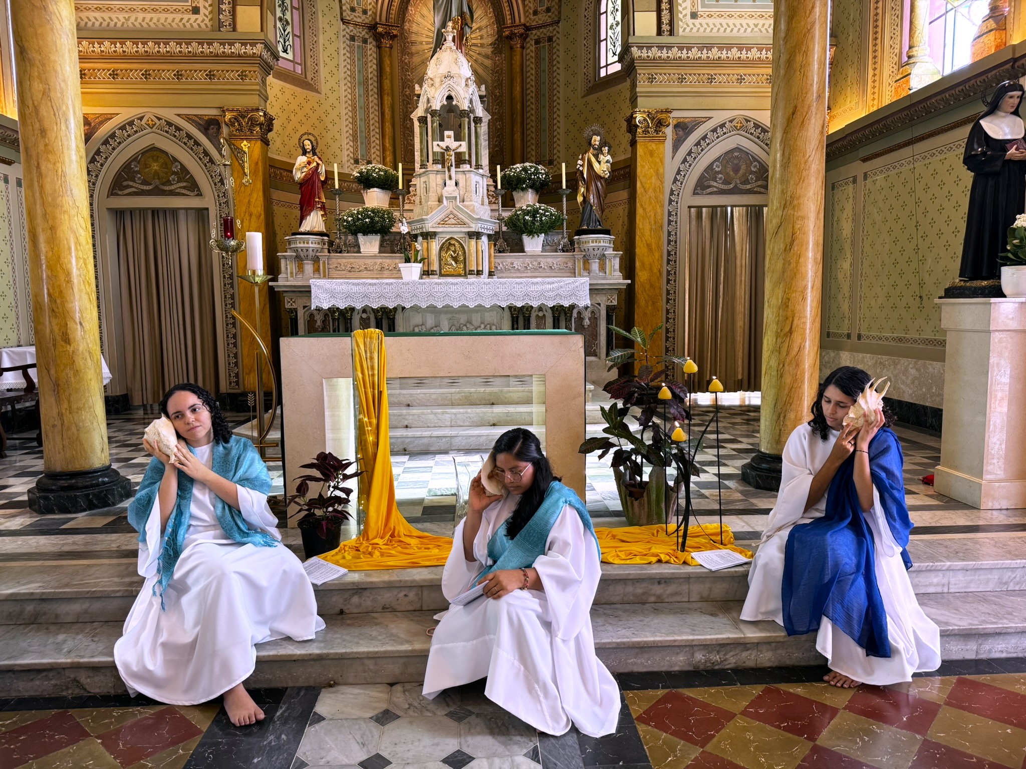 A figura da Santíssima Trindade, ou seja, o quadro formado pela voz, pela luz e pela presença do Pai, do Filho e do Espírito Santo; uma mesa em que o cálice é o centro. A partir desse momento, para mim se descortinou um grande momento de oração e de interioridade, que foi crescente, caminhando para a escuta — a escuta da voz dos personagens que, com a concha, ouviam a voz: a voz que vem de dentro e de fora.