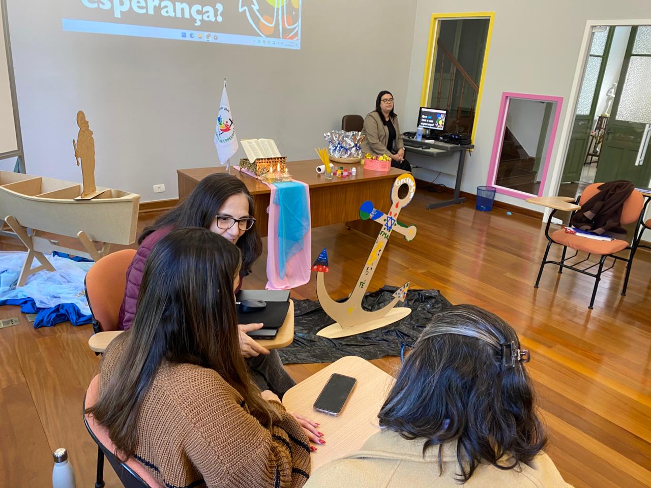 Na sequência, às 9h, a diretora-presidente da AEISSP, Irmã Teresa Cristina Domiciano, conduziu um momento oracional, que teve como fio condutor o tema do Ano Jubilar da Esperança, convidando os participantes a pintarem uma âncora (símbolo do jubileu), com as cores que melhor representam as situações vivenciadas neste ano.