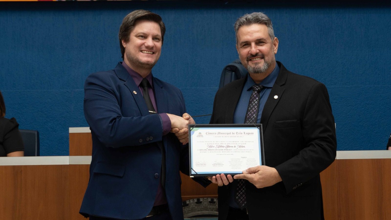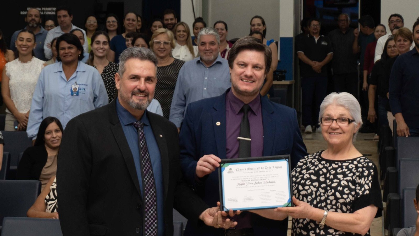 Uma noite brilhante, com muita emoção e homenagens, esse é o resumo da Moção de Reconhecimento aos 105 anos do Hospital Auxiliadora e Diploma de Mérito em Saúde Pública ao diretor geral do HNSA, Marco Calderon que aconteceu na última quinta-feira (27), na Câmara Municipal de Três Lagoas, propositura do vereador André Bittencourt.