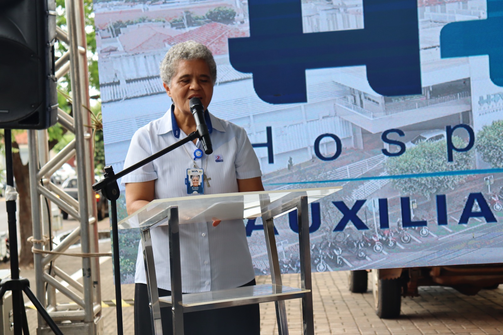 A diretora financeira iniciou a abertura da cerimônia agradecendo aos presentes e por compartilharem deste momento tão importante da saúde para a região, logo em seguida o Bispo Luiz Knupp realizou o momento de bênção e oração, juntamente com o vídeo gravado pela Diretora Presidente, Ir. Ivone Ranghetti.