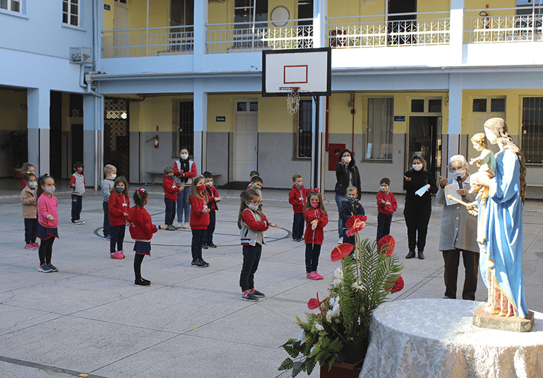 À tarde, o mesmo procedimento foi adotado e participaram presencialmente da coroação os alunos do Infantil 3, do 5º ano e do Projeto Contraturno 5.