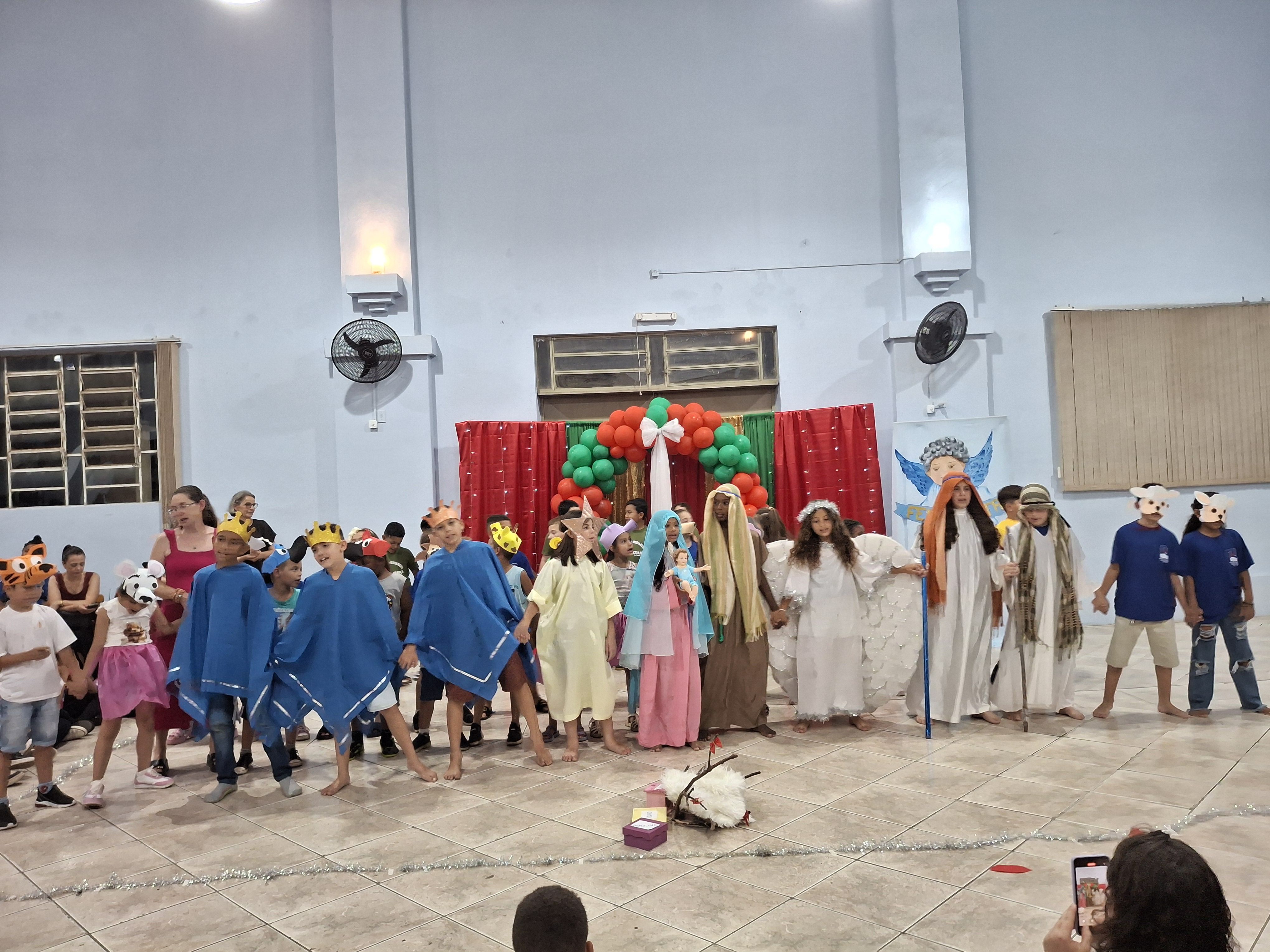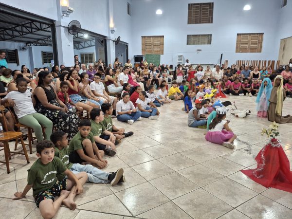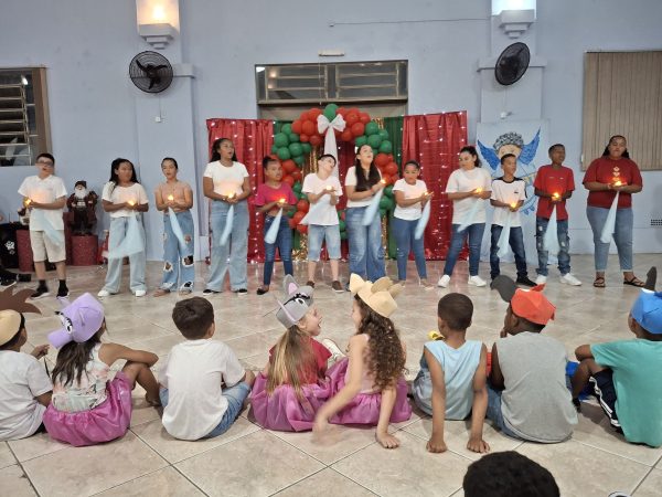 Com o objetivo de reforçar o verdadeiro sentido do Natal, os educandos da turma 4 encenaram a anunciação do Anjo, o nascimento de Jesus na gruta de Belém, a visita dos pastores e dos Reis Magos, finalizando com a música Então é Natal, da cantora Simone.