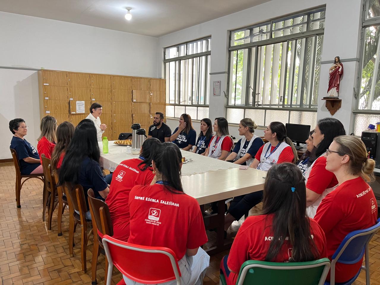 Em seguida, Irmã Paola teve um encontro com os professores do Ensino Fundamental - Anos Finais e do Ensino Médio, mais as lideranças pedagógico-pastorais da escola. O diálogo junto aos professores reforçou a importância de um ensino integrado a valores quando se está comprometido com a formação integral dos estudantes, bem como o quanto os valores são fundamentais nesse processo. A professora de Geografia, Larissa, expressou sua emoção: «Conversar com a Irmã Paola foi extremamente emocionante. Ela compartilhou sua história e missão religiosa de uma forma que foi profundamente inspiradora para todos nós». Também junto às lideranças, Irmã Paola desenvolveu uma reflexão sobre os desafios da contemporaneidade na perspectiva da educação salesiana.