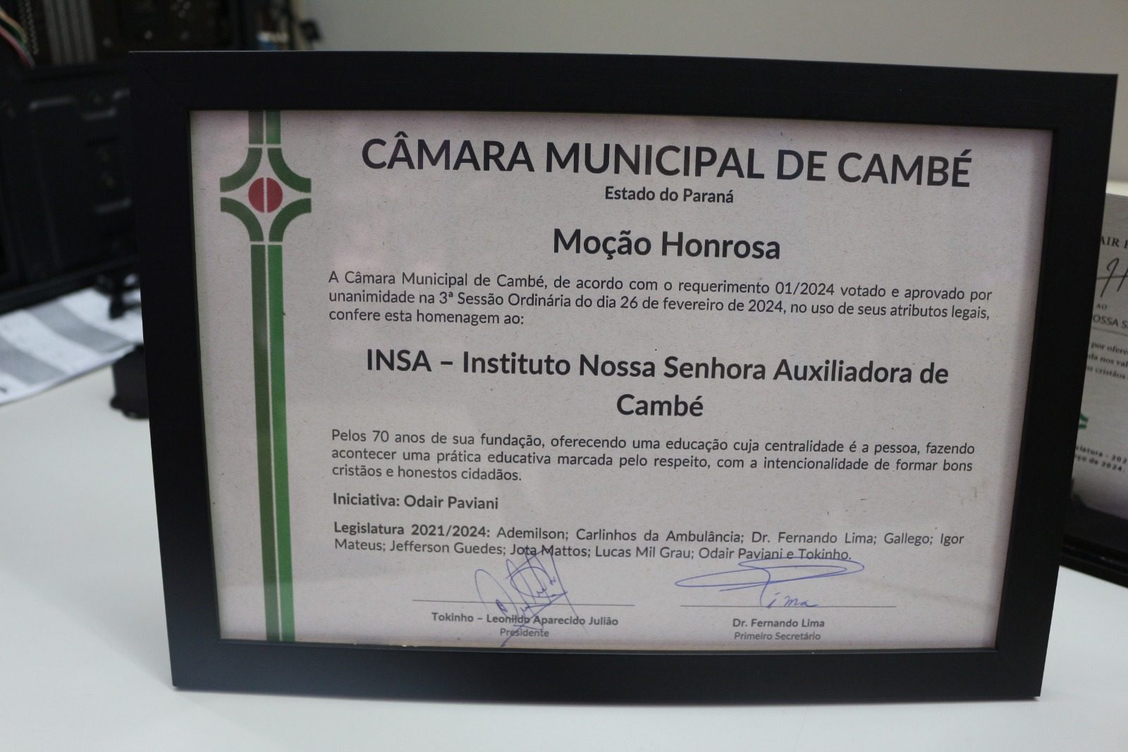 Instituto Nossa Senhora Auxiliadora de Cambé recebe Moção Honrosa