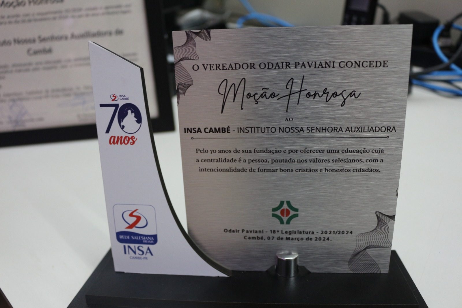 No dia 7 de março, a Câmara de Vereadores de Cambé/Paraná esteve presente na solenidade de comemoração dos 70 anos do Instituto Nossa Senhora Auxiliadora (INSA), realizada no ambiente da própria escola, no Espaço Auxiliadora.