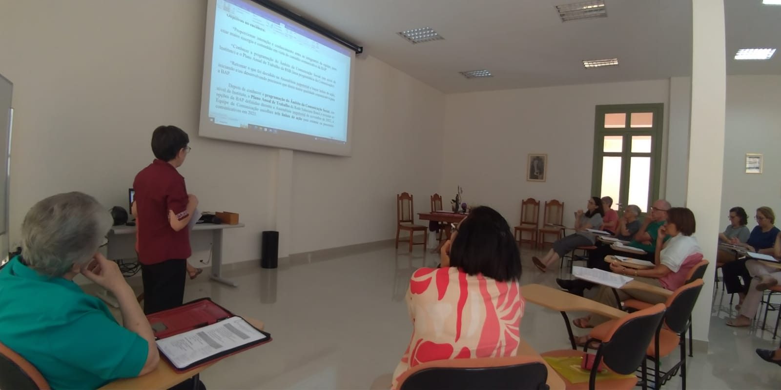 Assim, o Núcleo Animador se debruçou sobre o empenho da caminhada de cada Âmbito, apreciando as propostas contempladas pelas Linhas de Ação das opções prioritárias: Formação, Sinodalidade Missionária e Ecologia Integral, já elaboradas ou em construção, apresentadas pelas respectivas Irmãs responsáveis. Irmã Teresa Cristina Pisani Domiciano (Missão-Pastoral) e Irmã Dorcelina Rampi (Administrativo) realizaram a apresentação no período da manhã.