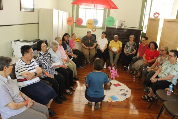 No terceiro dia da Assembleia, as Irmãs encontraram-se novamente em pequenos grupos e tiveram um tempo bastante prolongado para refletir sobre a vida e a missão, a partir de um estudo realizado ao longo do ano nas comunidades. Durante 2023, as comunidades fizeram a leitura e partilha do livro de Amadeo Cencini, “Abraçar o futuro com esperança – O amanhã da Vida Consagrada”. Nos grupos, as participantes se questionaram como é possível abraçar o futuro com esperança, considerando as três opções prioritárias do XXIV Capítulo Geral das FMA, contemplados também no Plano de Ação Inspetorial: a Formação, a Sinodalidade Missionária e a Ecologia Integral.