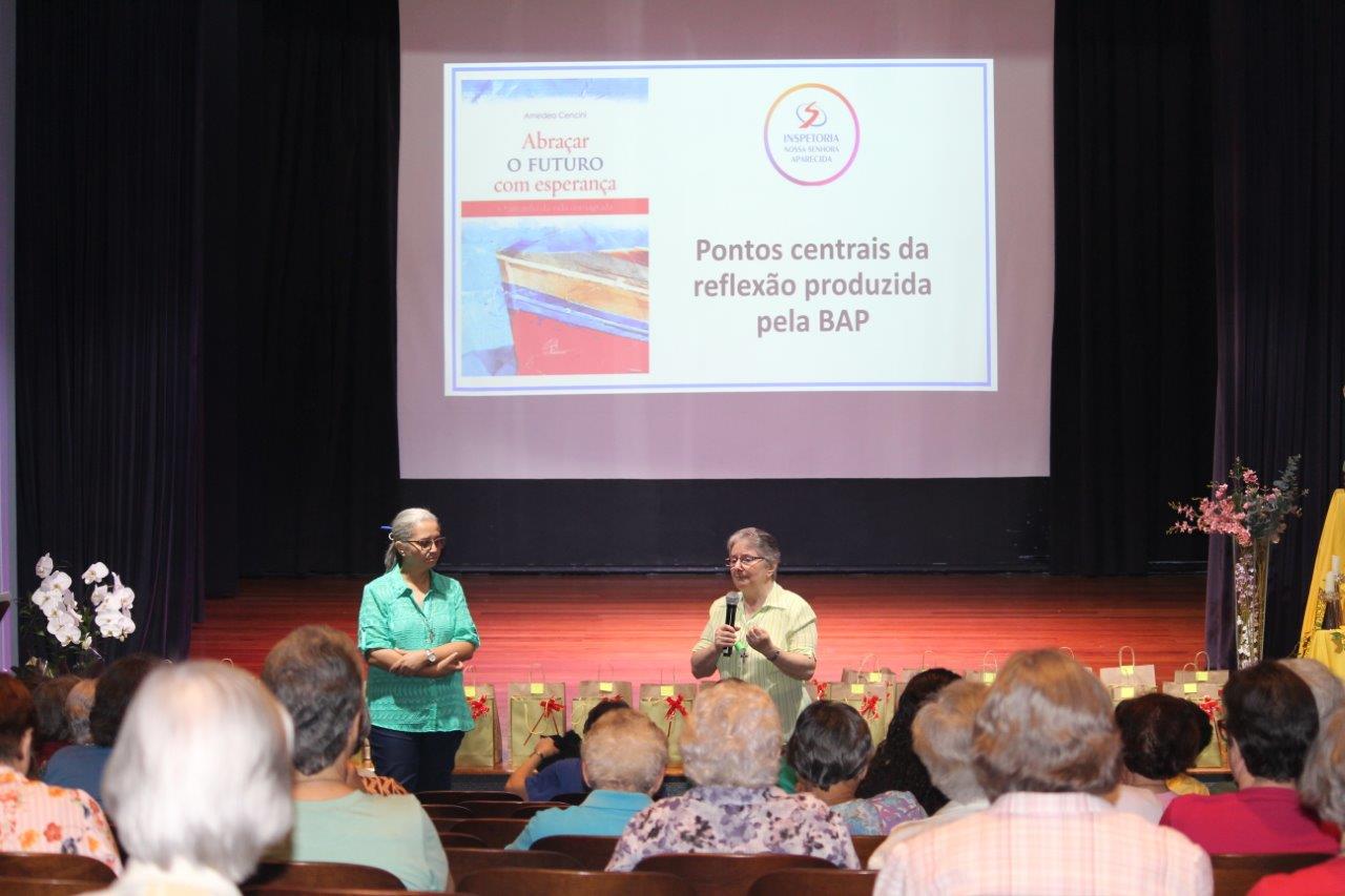 Na sessão de encerramento da Assembleia, a Inspetora – Ir. Alaíde Deretti – voltou a insistir sobre a necessidade de maior comunhão e sinodalidade na Inspetoria: «Daqui sairemos mais Inspetoria, mais irmanadas, mais enriquecidas, mais abertas para acolher-nos nas diferenças, olhando-as como riqueza, porque somos mais BAP, somos a Inspetoria Nossa Senhora Aparecida! Com decisão e renovada paixão apostólica salesiana, abracemos nossas realidades seguindo os passos de Jesus, de Maria, dos discípulos, acolhendo-nos como BAP inteira, dilatando as fronteiras do nosso coração, alargando o horizonte de nossa vida em missão».