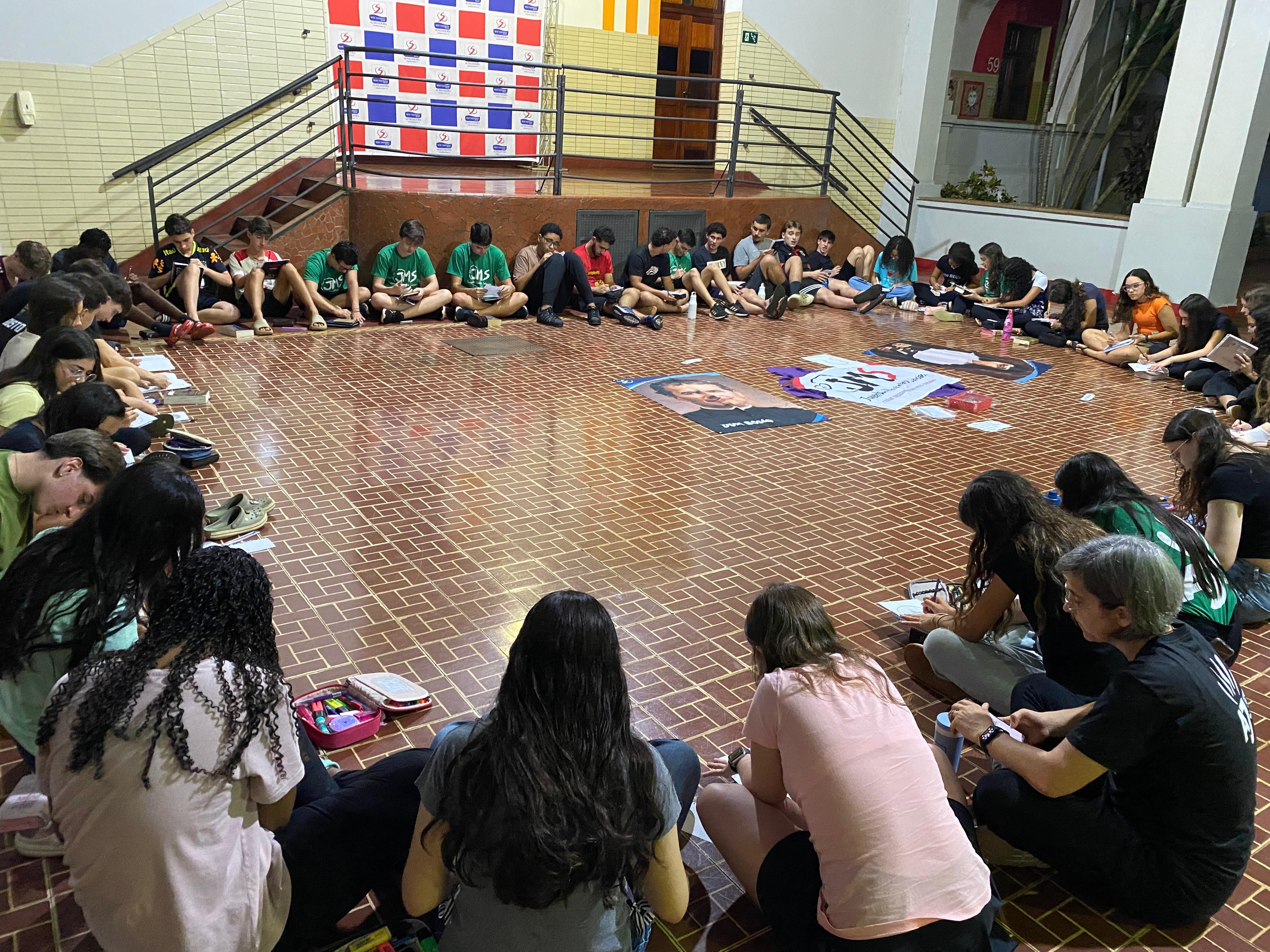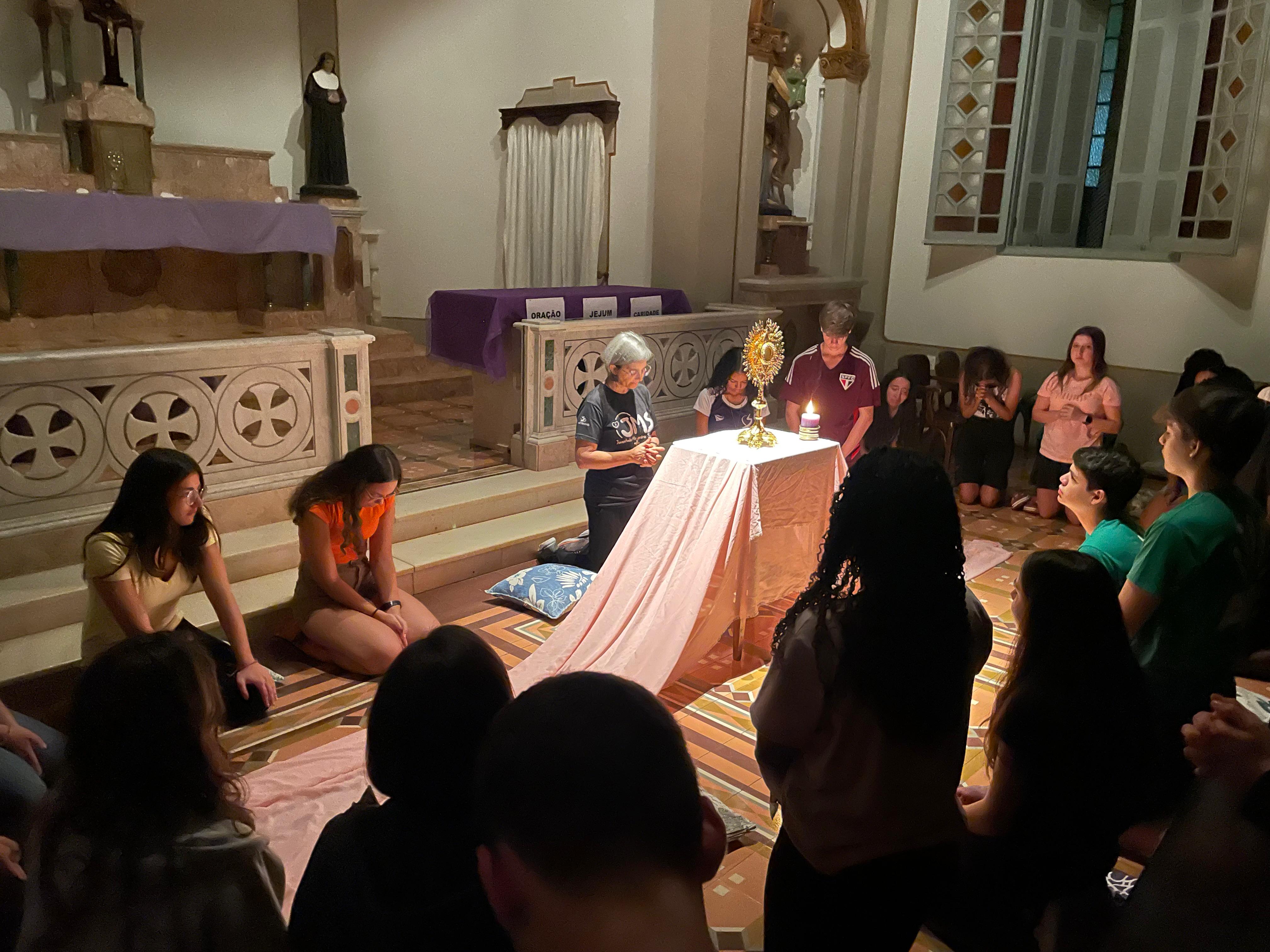 À noite, um momento especial de Adoração ao Santíssimo marcou o encerramento do primeiro dia. Durante a oração, um estudante representou Jesus flagelado, enquanto os demais meditavam sobre a dor, a entrega e o amor de Cristo por toda a humanidade.