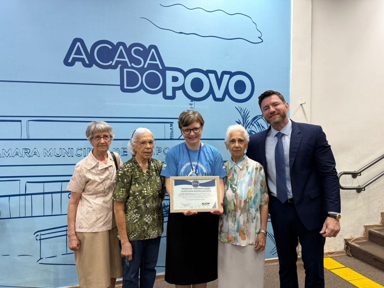 Representando o colégio, a Diretora Institucional, Irmã Márcia Koffermann, recebeu a homenagem em nome de toda a comunidade educativa. Também estiveram presentes outras Irmãs da comunidade religiosa - Maria Nilda Cavalcante Rangel, Othilia Pires dos Santos e Luzia Candida da Silva - celebrando este marco que simboliza um século de compromisso com a formação integral, inspirada no carisma salesiano.