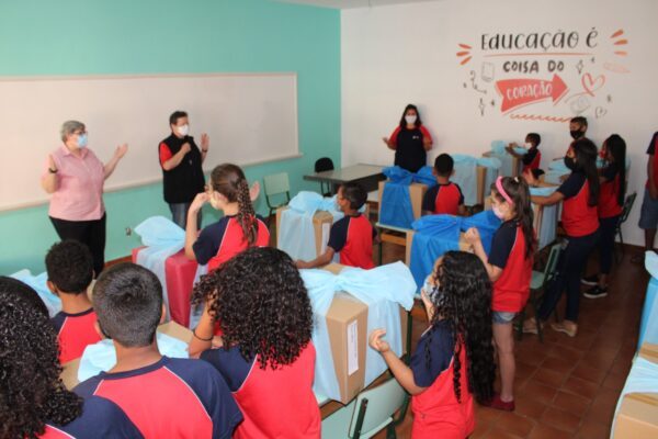 A cerimônia de entrega foi realizada no salão, conduzida por Ir. Metka, que realizou uma dinâmica de apresentação e de conscientização do valor educativo de um computador.