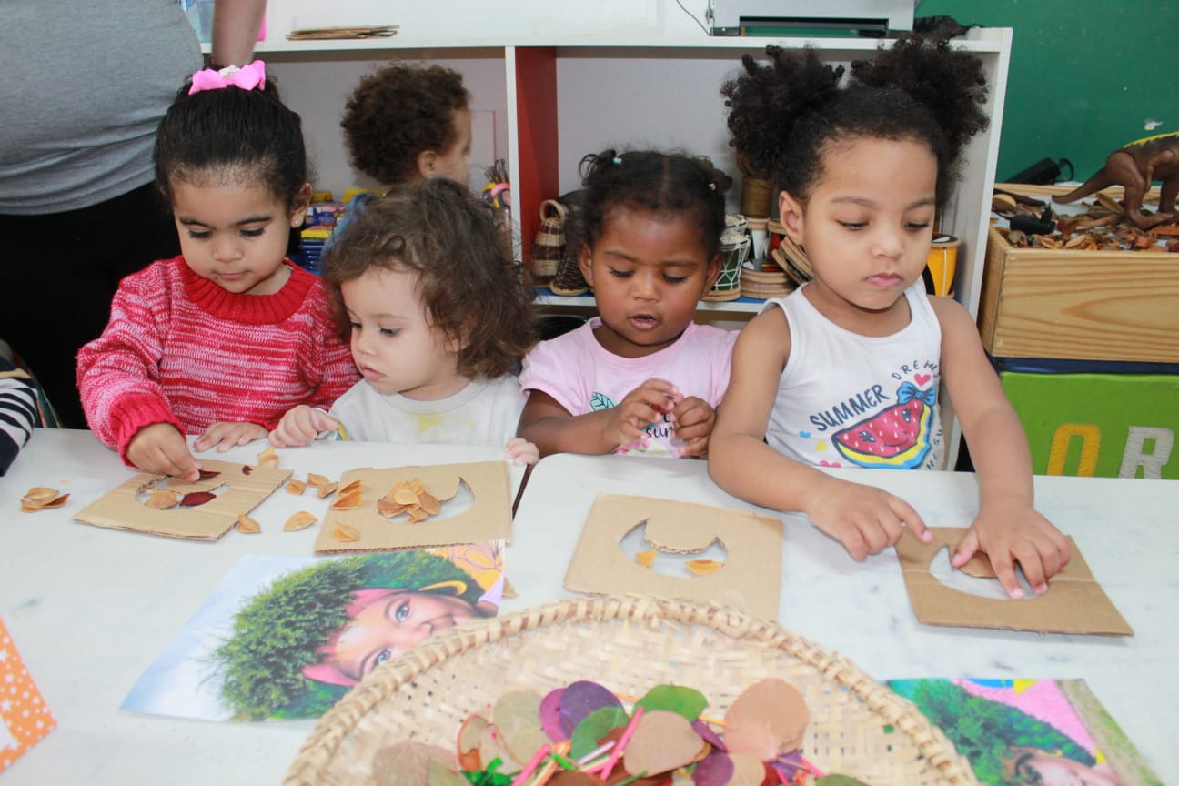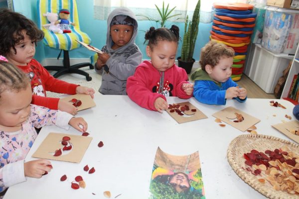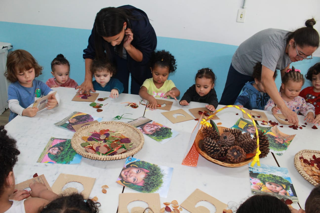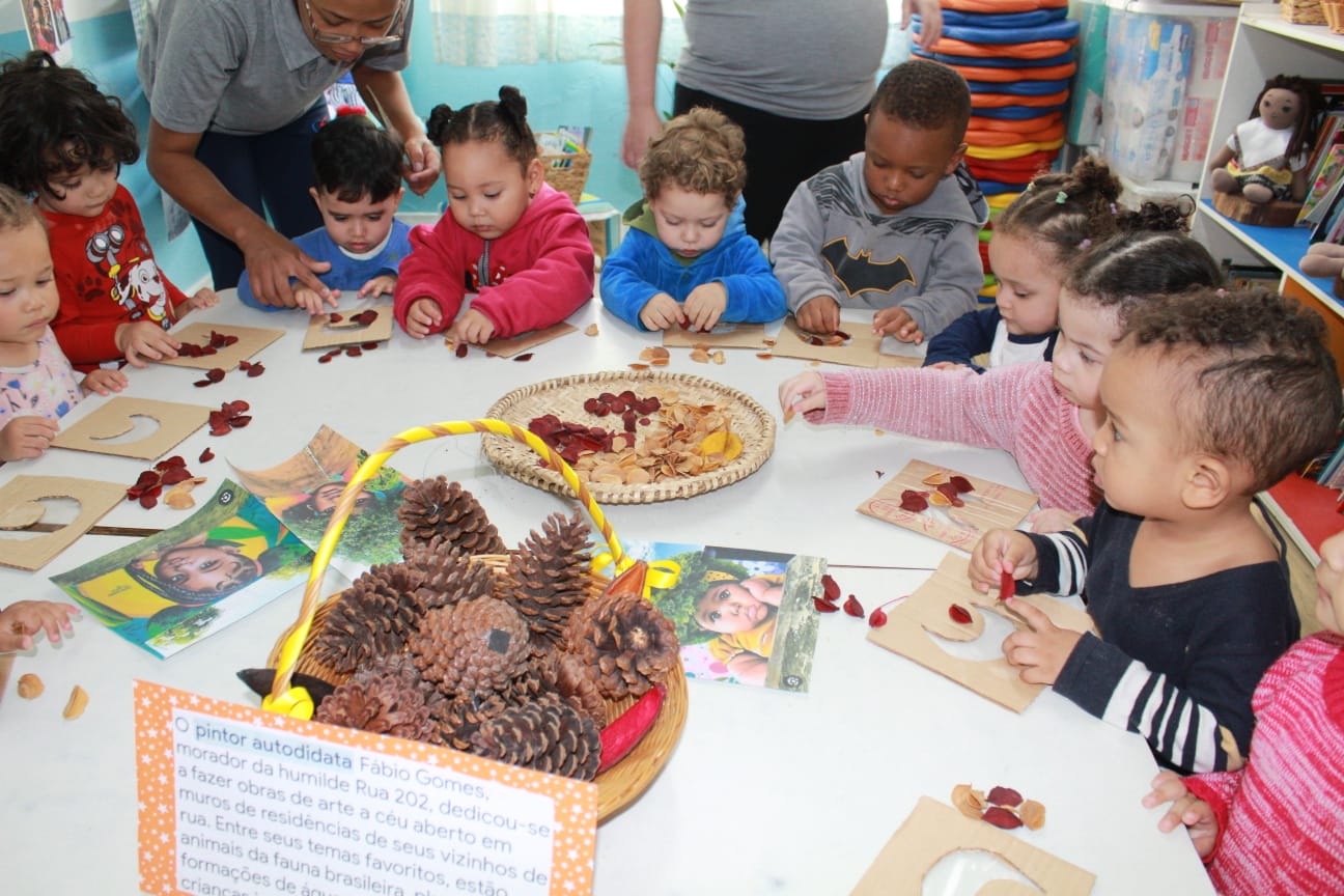 Na atividade, as crianças exploraram diferentes tipos de folhas, percebendo suas texturas, formatos e cores, para criar uma colagem coletiva em um painel de papelão, inspirada nas obras de Fábio Gomes. Com o apoio das professoras, elas manusearam os materiais com concentração e curiosidade, dando origem a uma composição artística cheia de cor e significado, que agora está exposta nas salas do CEI. A experiência valorizou a sensibilidade e a criatividade dos pequenos artistas do Berçário II.