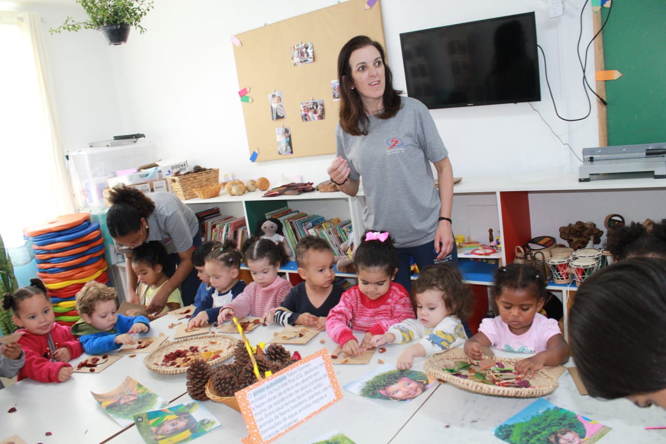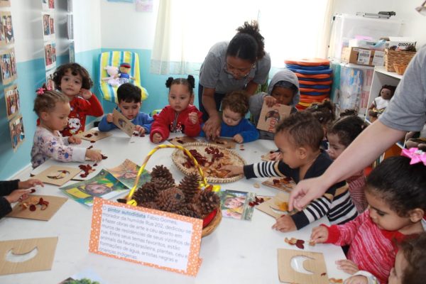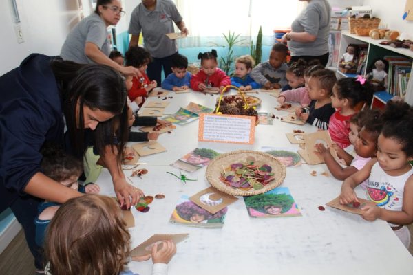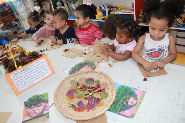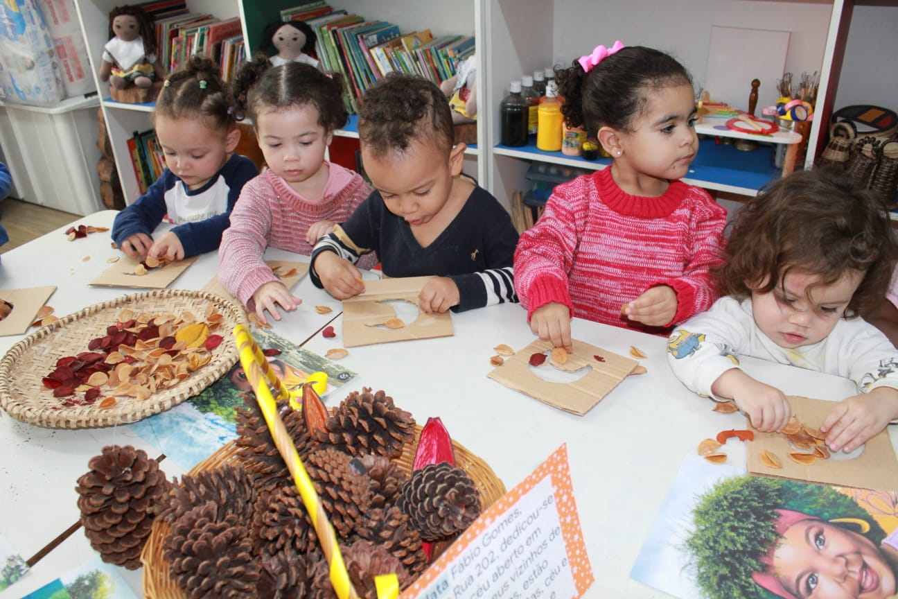 Na atividade, as crianças exploraram diferentes tipos de folhas, percebendo suas texturas, formatos e cores, para criar uma colagem coletiva em um painel de papelão, inspirada nas obras de Fábio Gomes. Com o apoio das professoras, elas manusearam os materiais com concentração e curiosidade, dando origem a uma composição artística cheia de cor e significado, que agora está exposta nas salas do CEI. A experiência valorizou a sensibilidade e a criatividade dos pequenos artistas do Berçário II.
