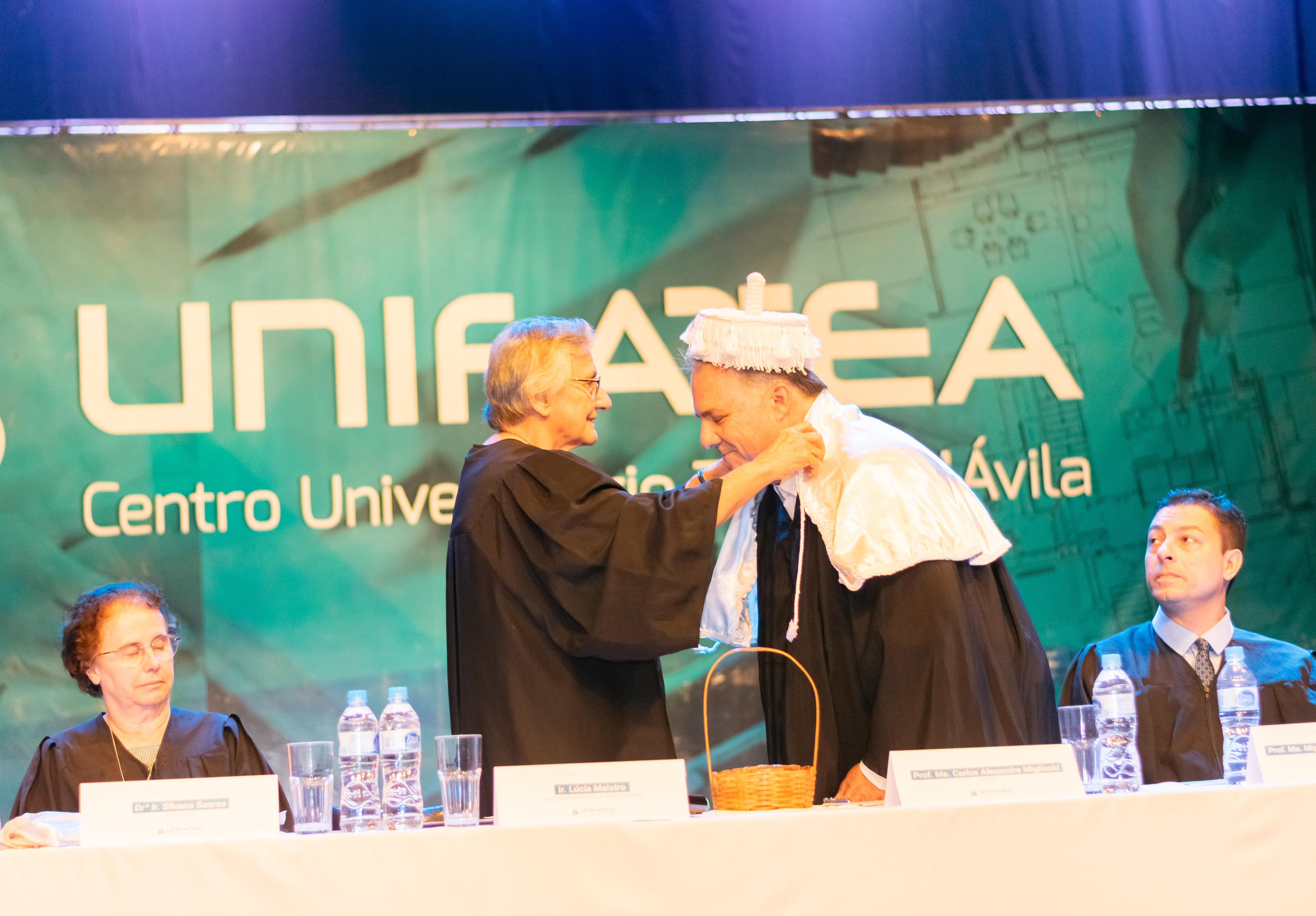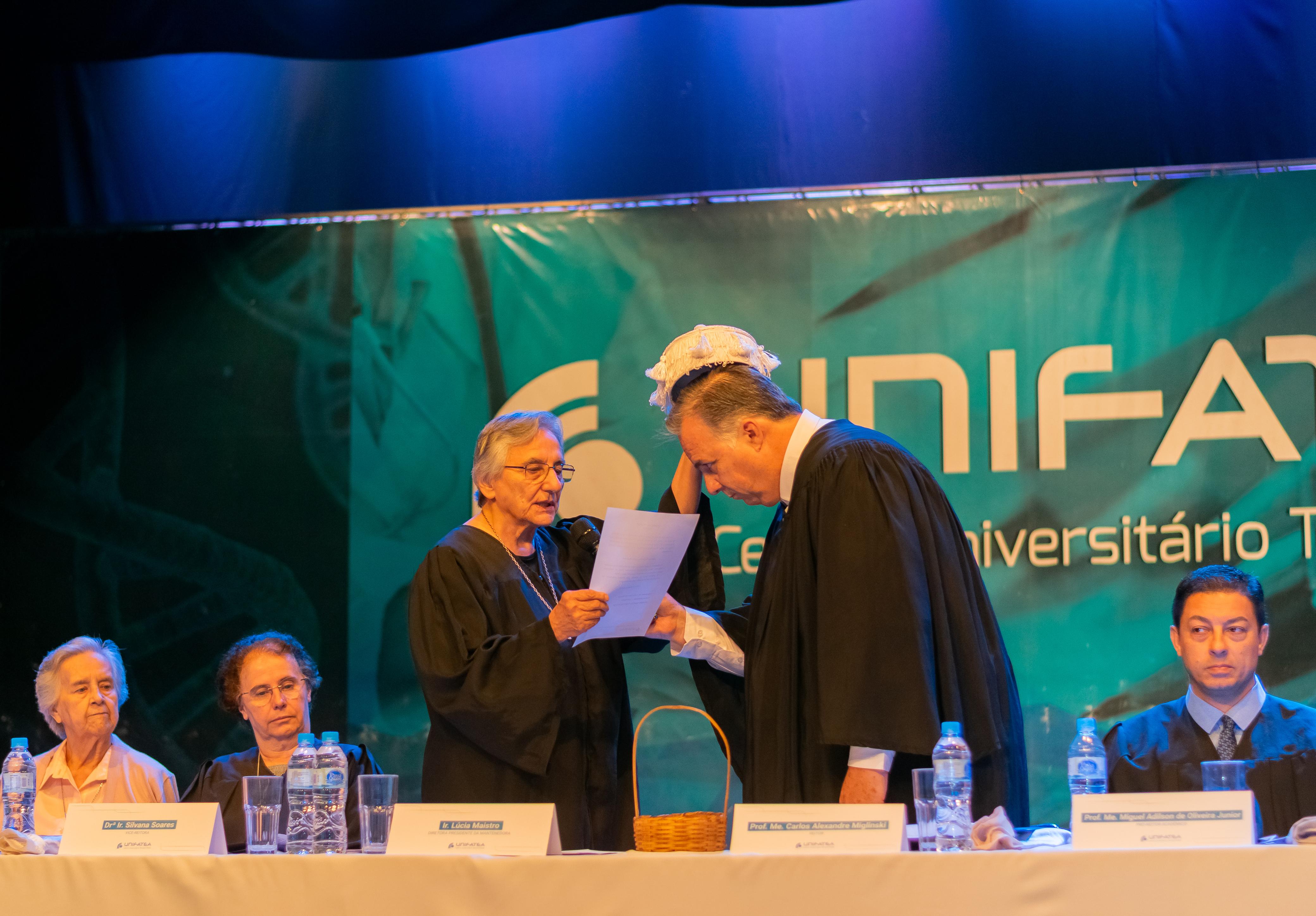 O Centro Universitário Teresa D’Ávila – Unifatea realizou, na noite desta terça-feira (12), uma cerimônia de posse e recondução de seus gestores. O evento oficializou a nomeação do professor Carlos Alexandre Miglinski como novo reitor e da Irmã Silvana Soares como nova vice-reitora. Além disso, os pró-reitores Miguel Júnior (acadêmico), Jacques Ribas (administrativo-financeiro) e Professor Dr. Nelson Matias Tavares (Pesquisa, Pós-Graduação e Extensão) foram reconduzidos aos seus respectivos cargos.