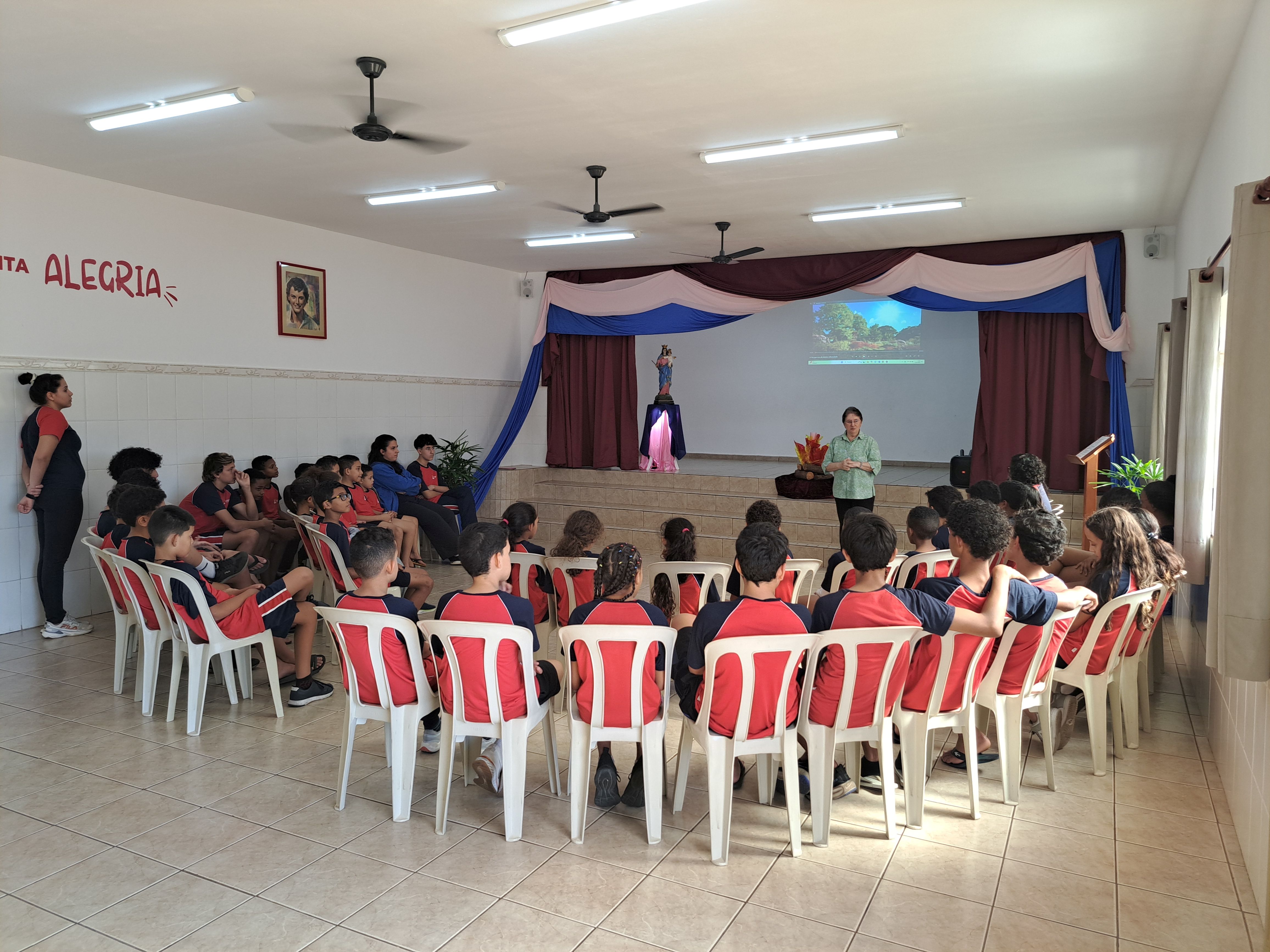 À tarde, foi a vez dos educandos homenagearem a visitante com um momento especial. Em um gesto cheio de carinho, os adolescentes leram frases em formato de coração e, em seguida, emocionaram a todos com a interpretação da música Oração (A Banda Mais Bonita da Cidade). Irmã Alaíde agradeceu com ternura e conduziu uma reflexão com os jovens, destacando a importância da partilha e como cada um pode contribuir para manter o “fogo aceso” por meio de seus dons e talentos.